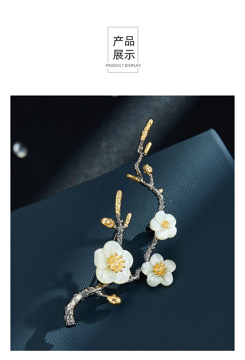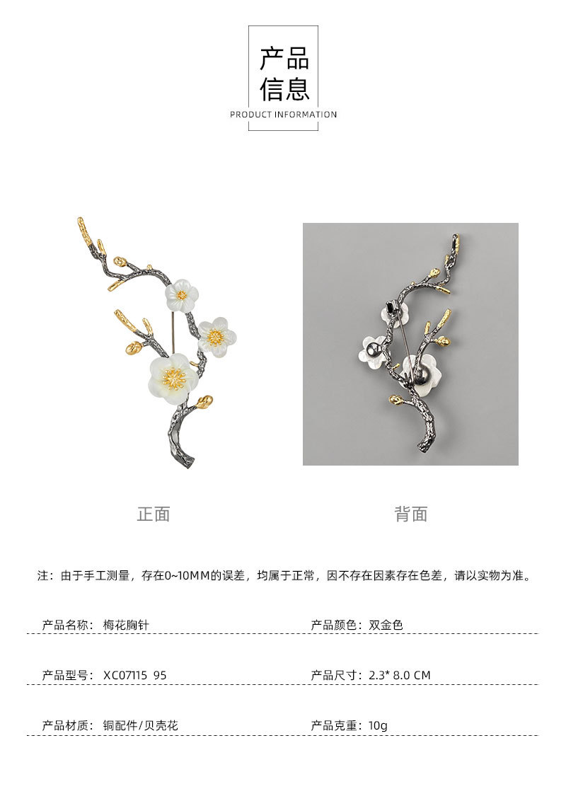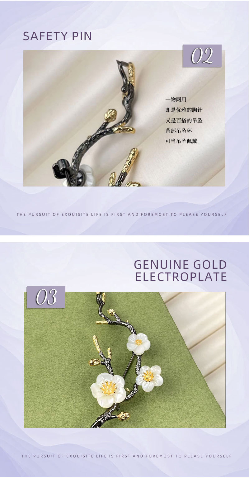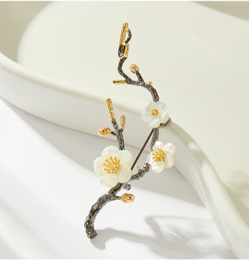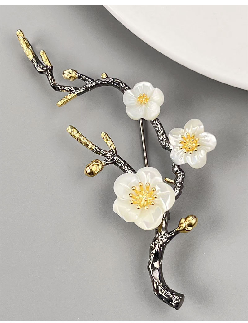 Fashionable and light luxury two-color golden plum flower brooch, light luxury and high-end shell flower brooch, new retro and elegant women's brooch