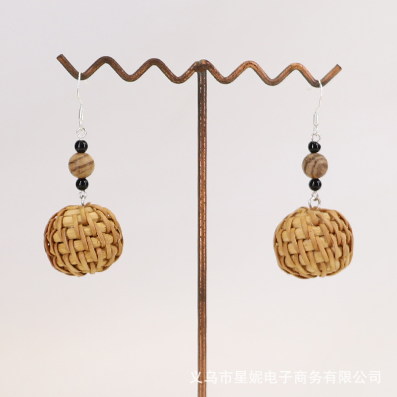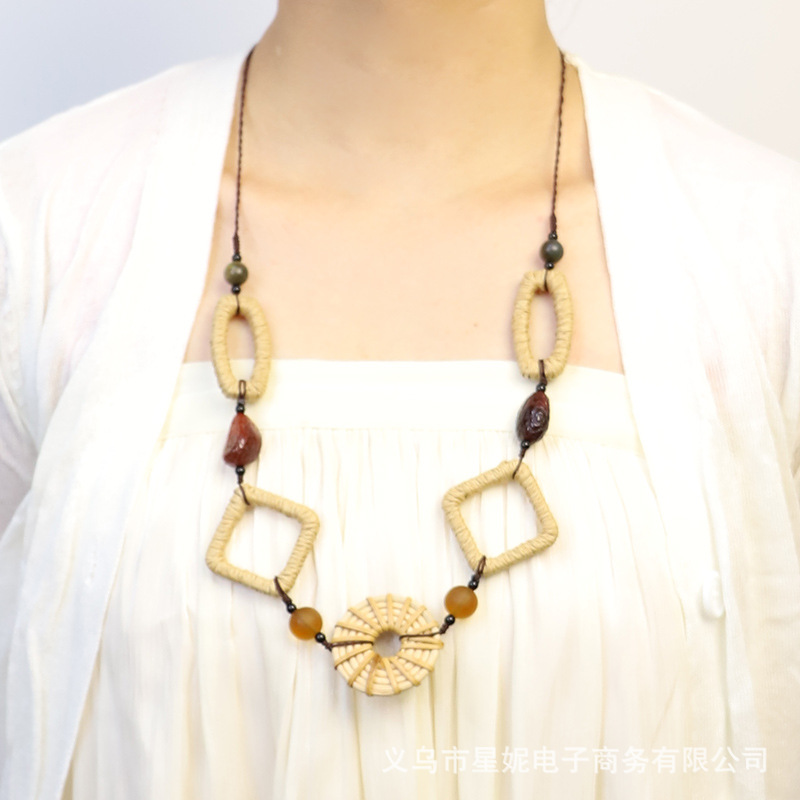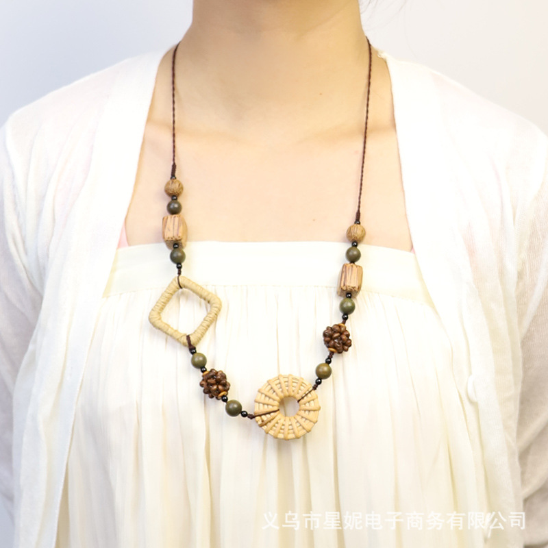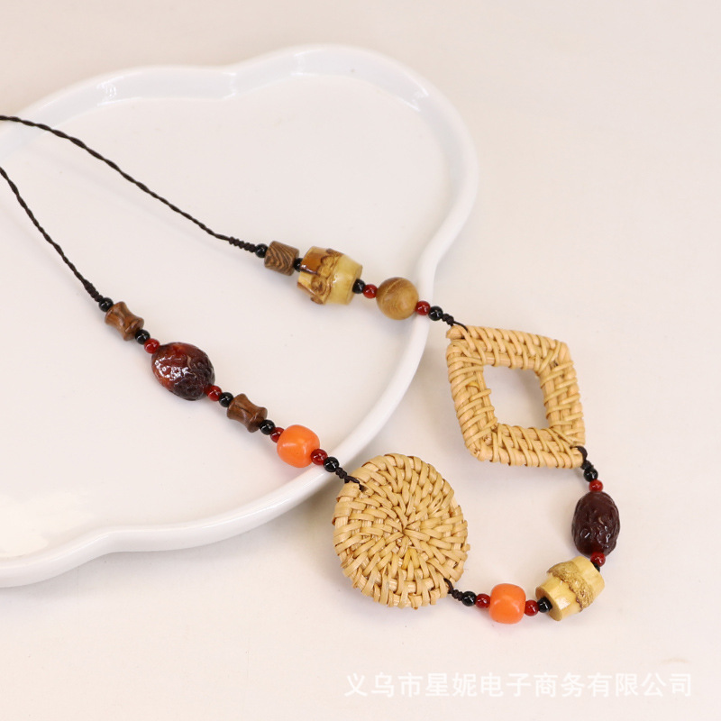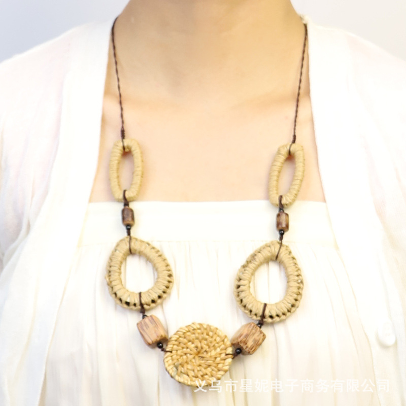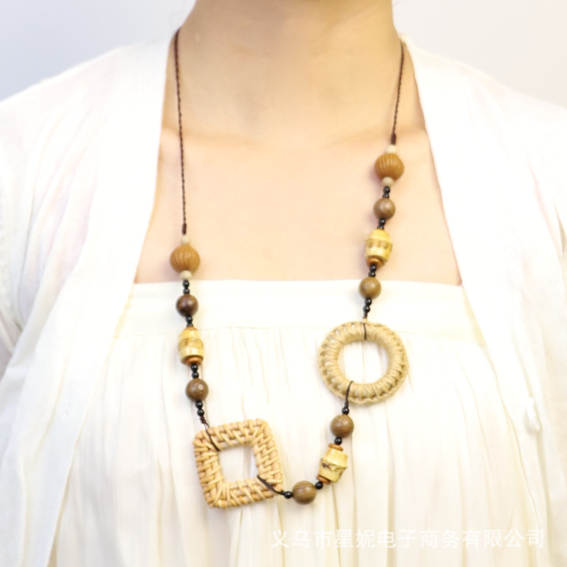 Fashionable and versatile ethnic style accessories, Bohemian vacation style random wooden bead earrings, grass woven long necklace