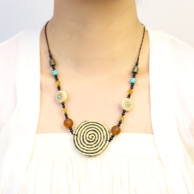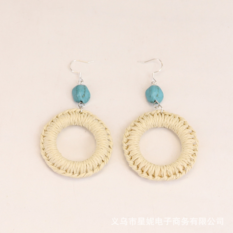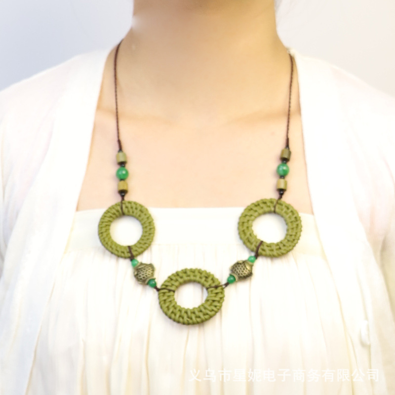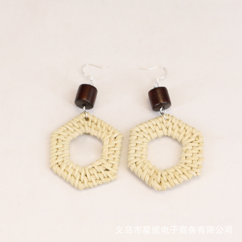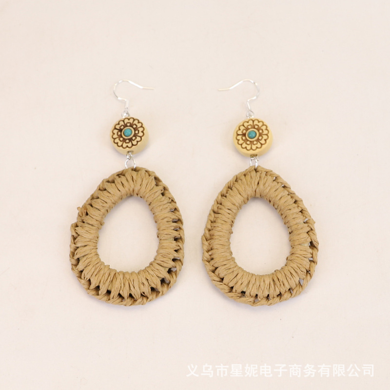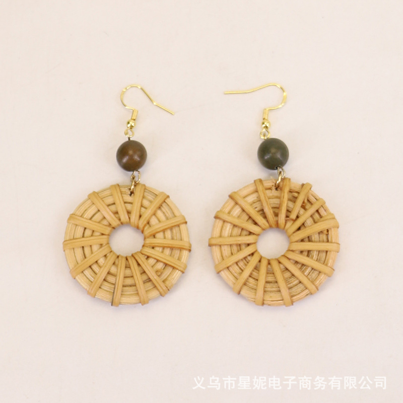 Fashionable and versatile ethnic style accessories, Bohemian vacation style random wooden bead earrings, grass woven long necklace