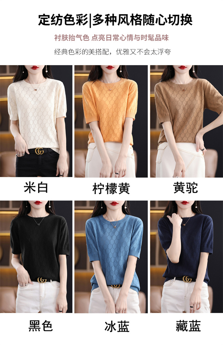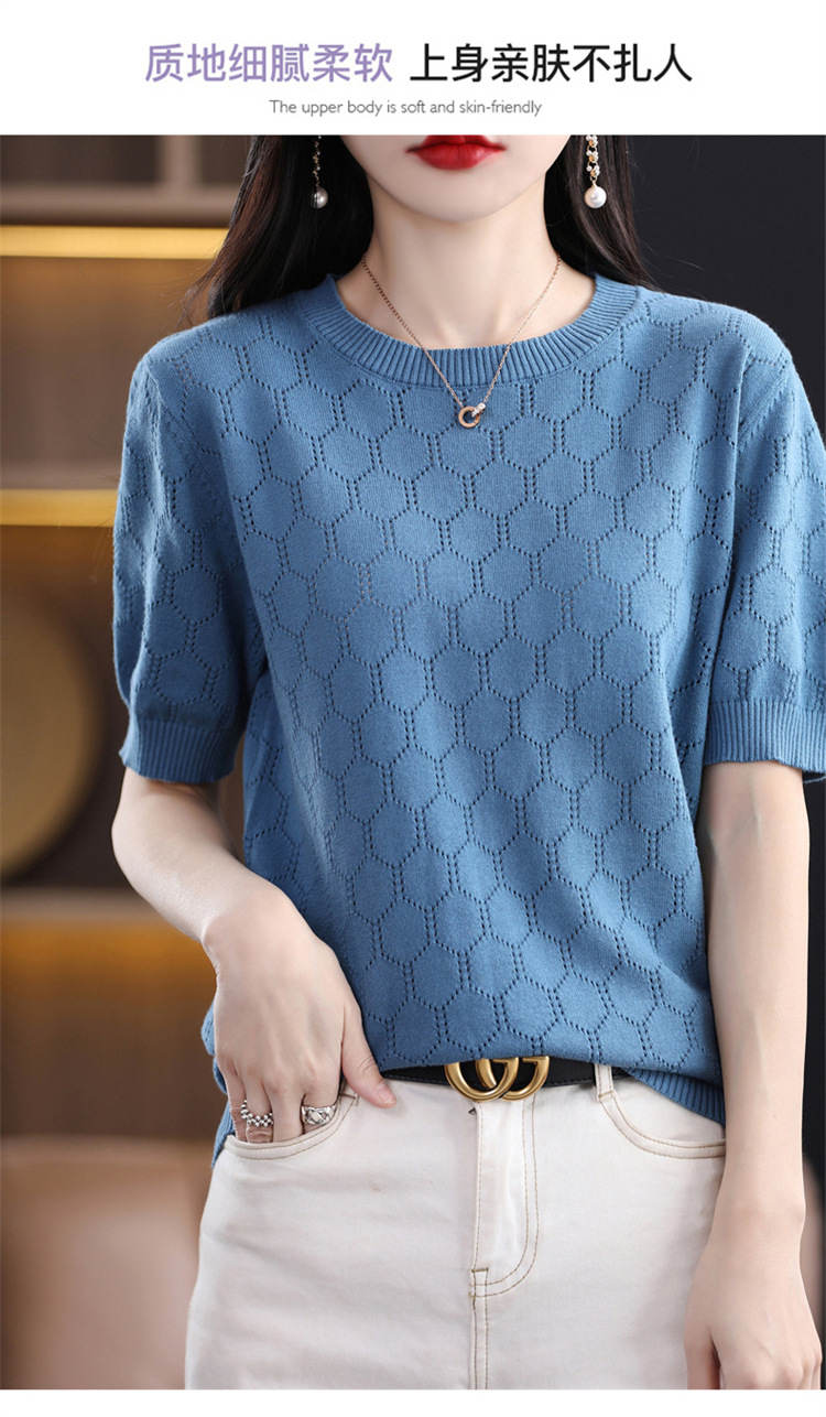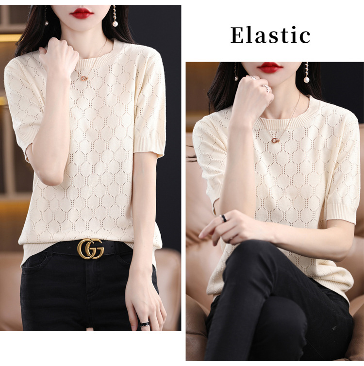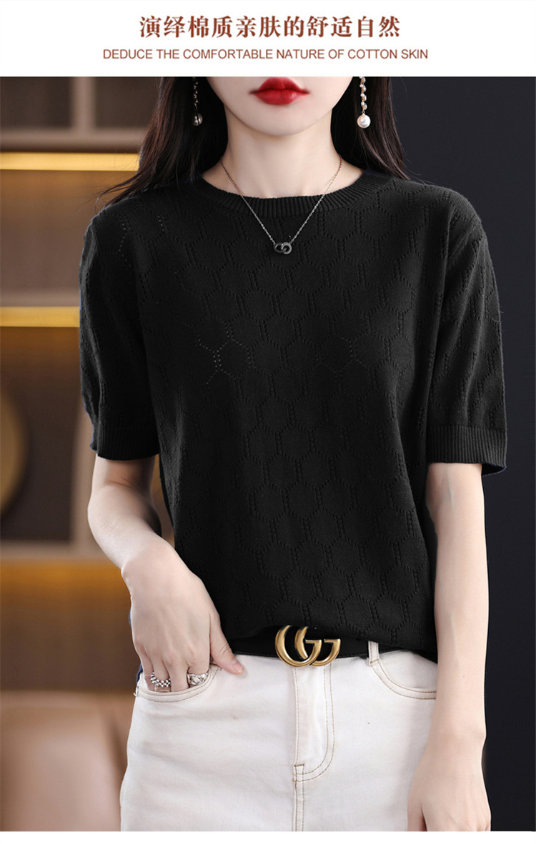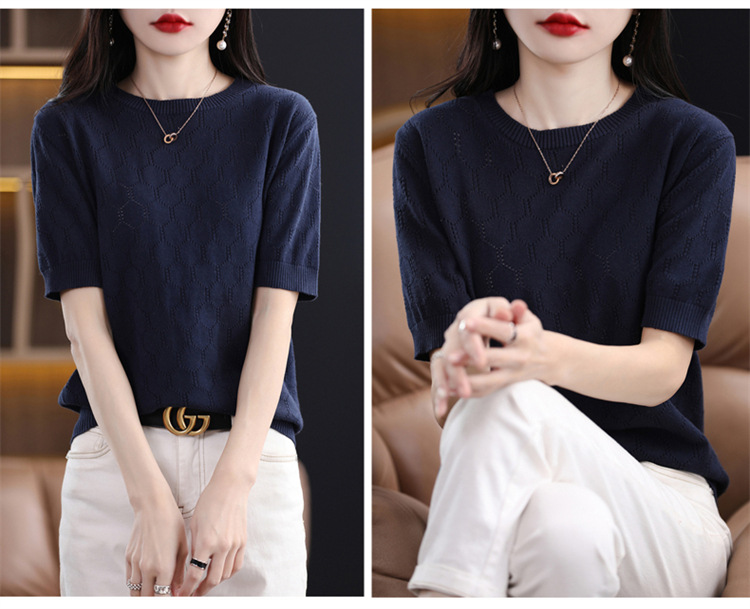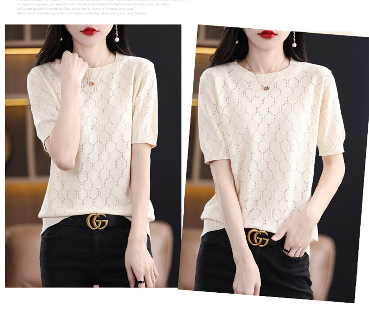 Fashionable hollowed-out cotton thread knitted short-sleeved T-shirt for women 2023 Summer new style round-neck loose T-shirt half-sleeved women's distribution service