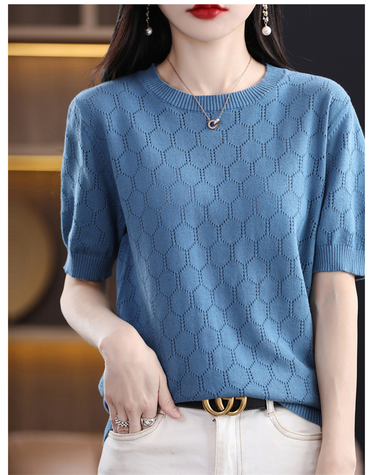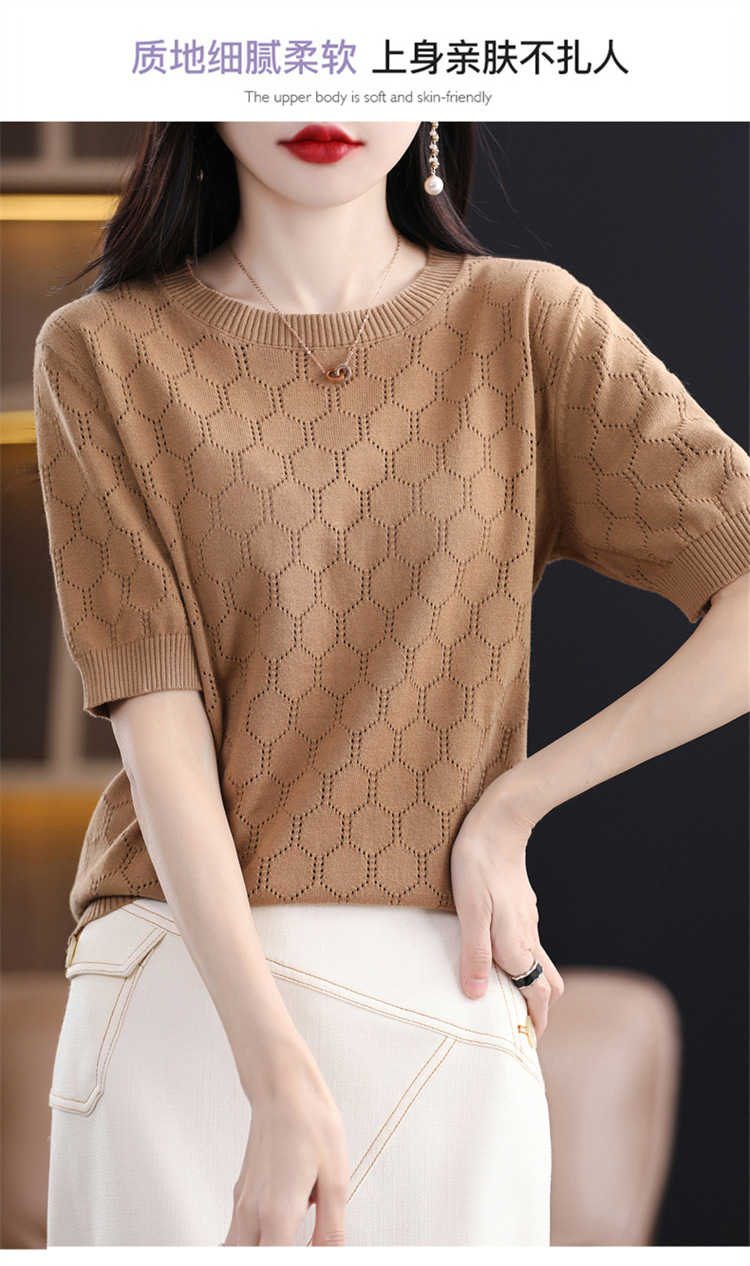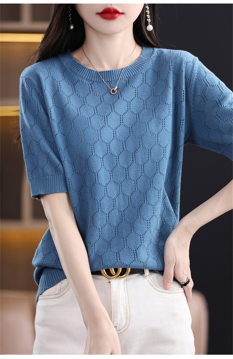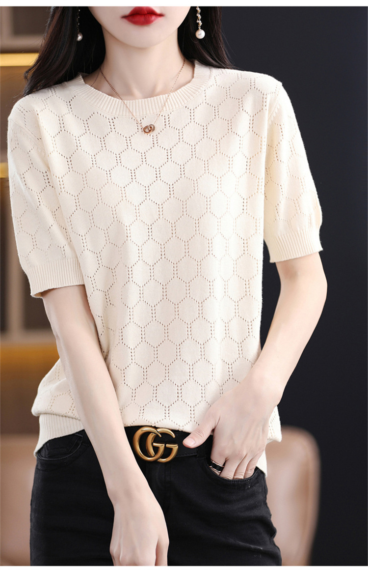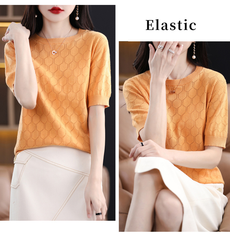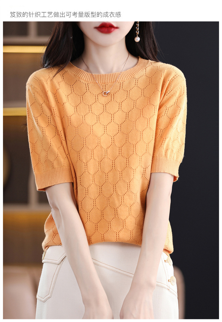 Fashionable hollowed-out cotton thread knitted short-sleeved T-shirt for women 2023 Summer new style round-neck loose T-shirt half-sleeved women's distribution service