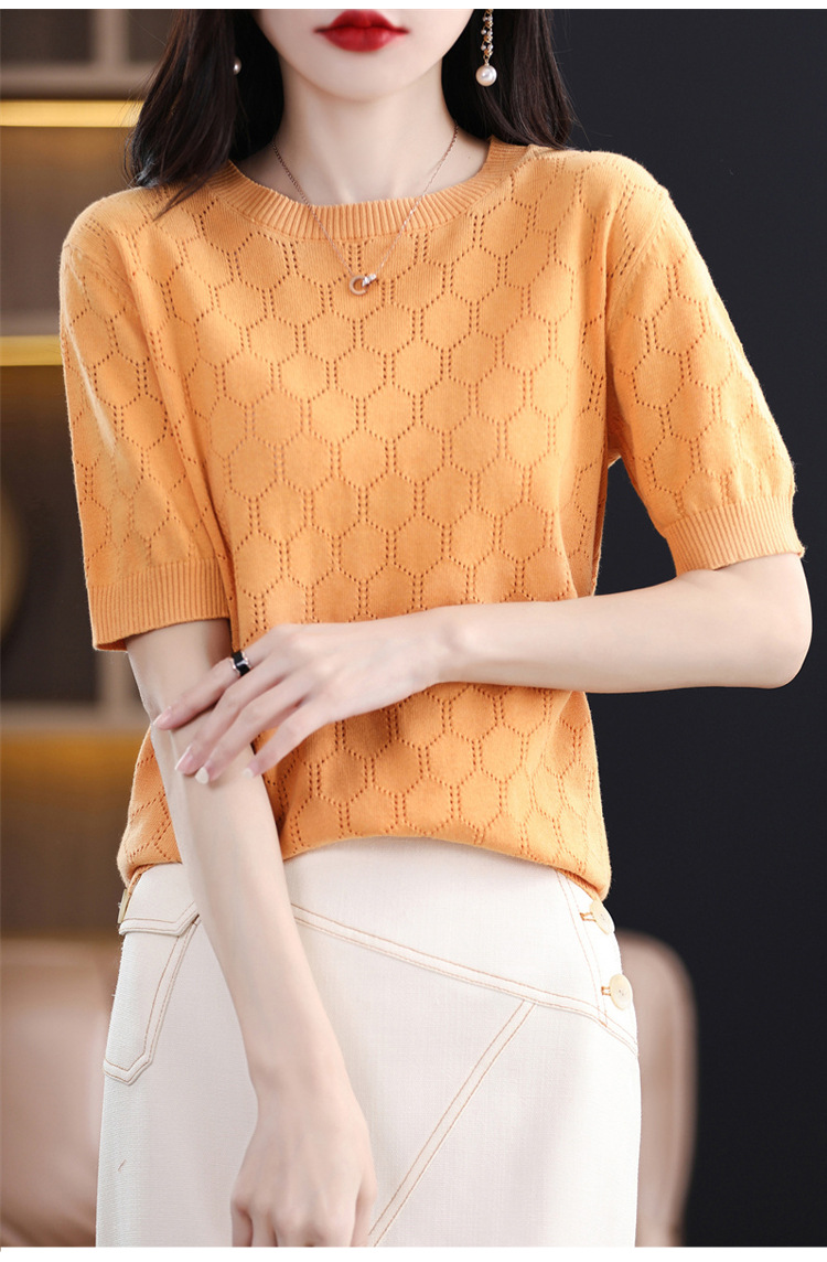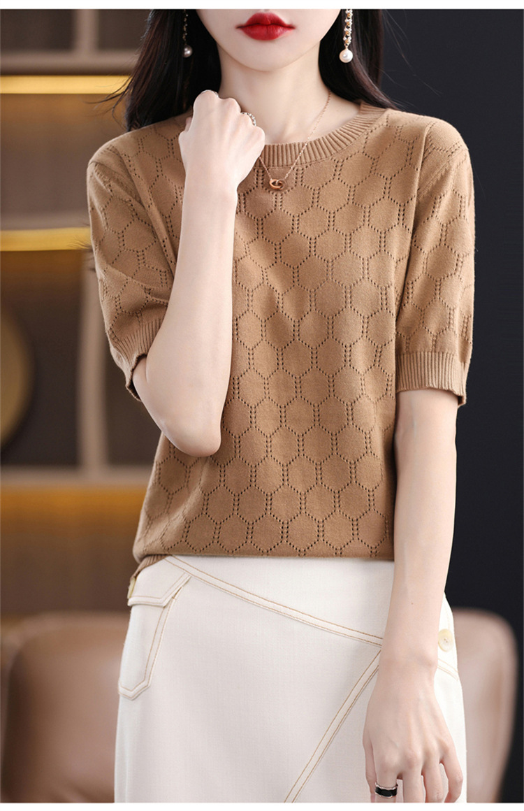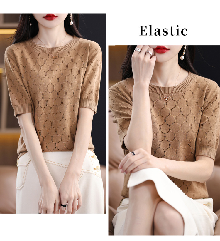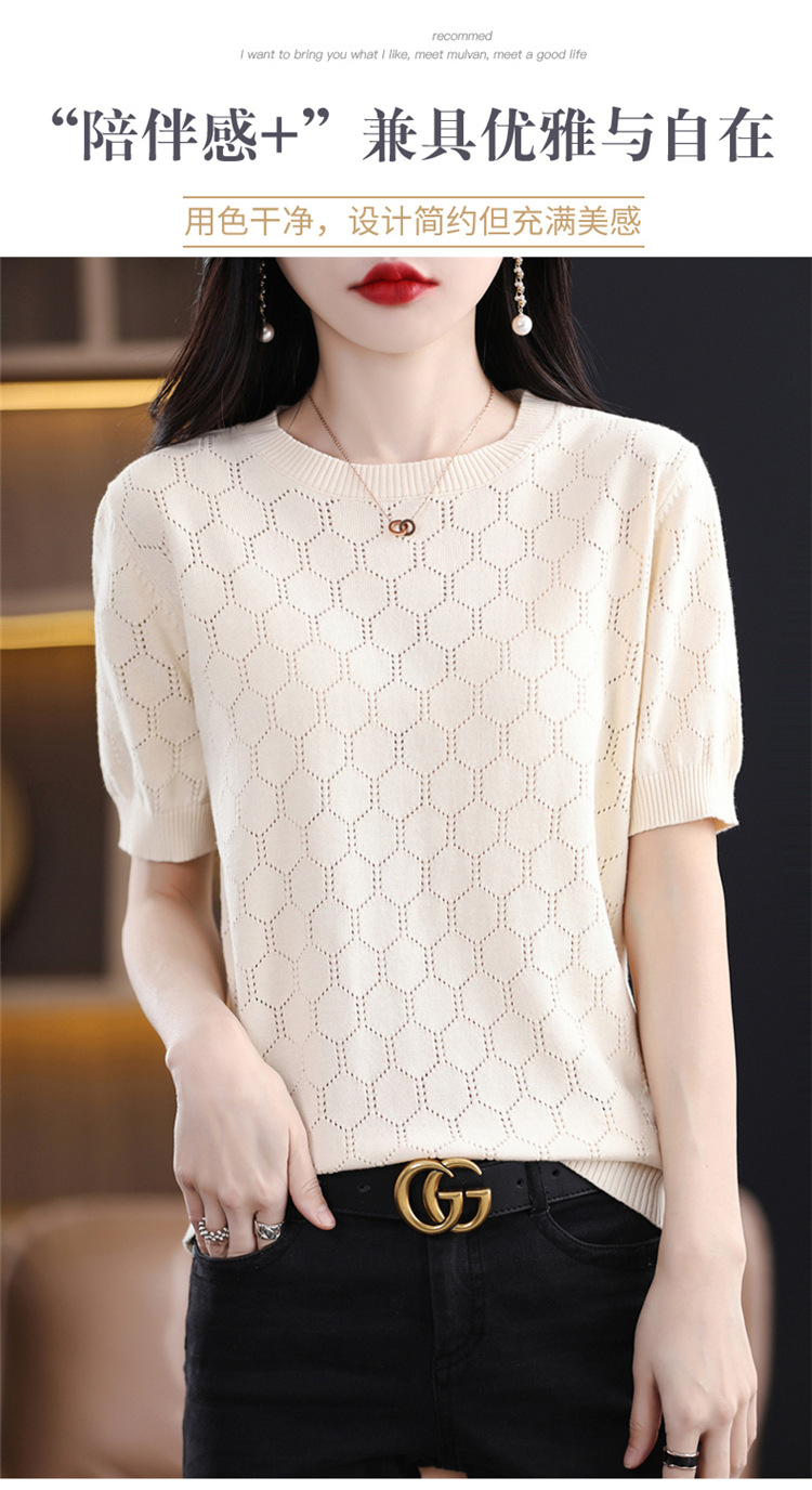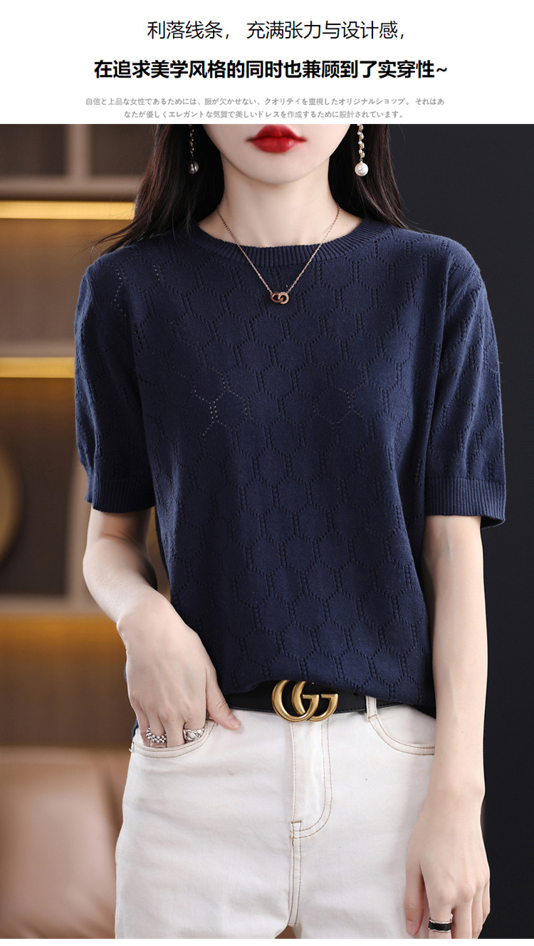 Fashionable hollowed-out cotton thread knitted short-sleeved T-shirt for women 2023 Summer new style round-neck loose T-shirt half-sleeved women's distribution service