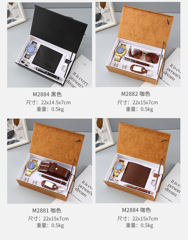 【M2884# Brown 】 5-piece Set (Steel Watch + Wallet + Pen + Keychain + cufflinks)