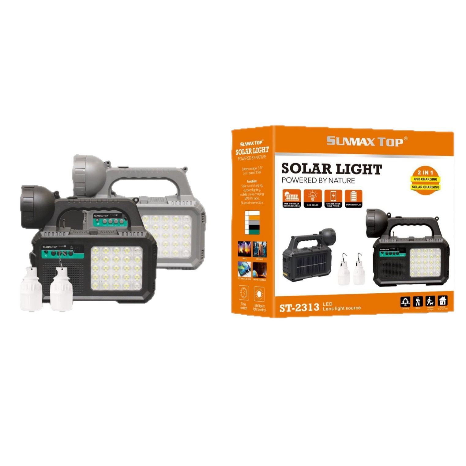It comes with 2 switch bulbs, USB for mobile phone charging, camping charger, FM radio and Bluetooth