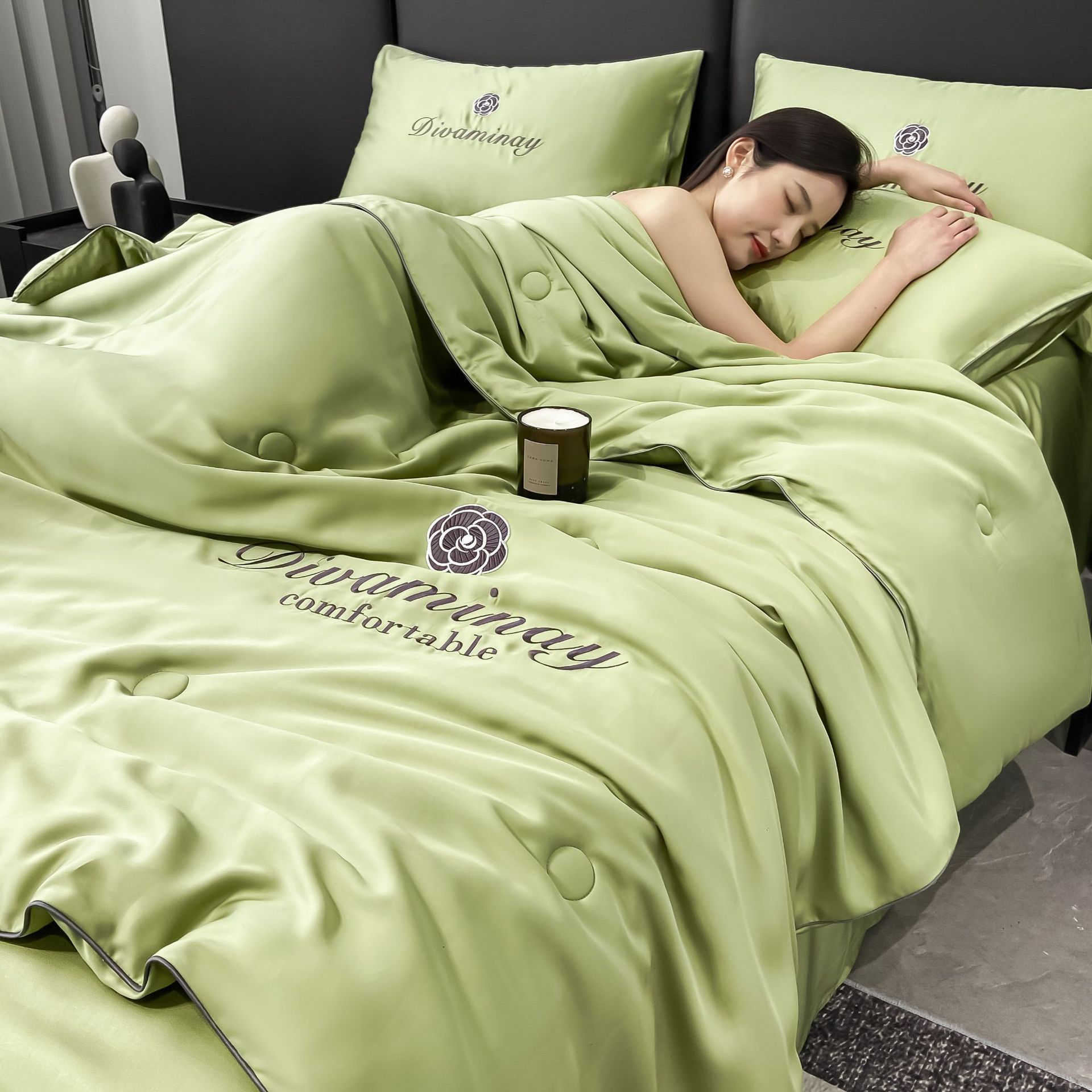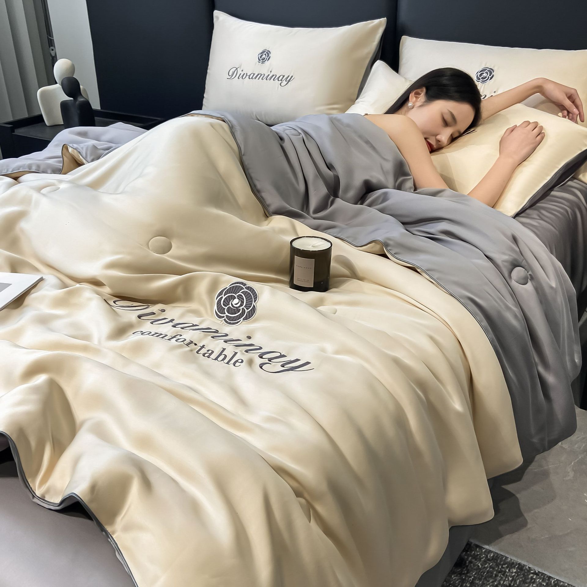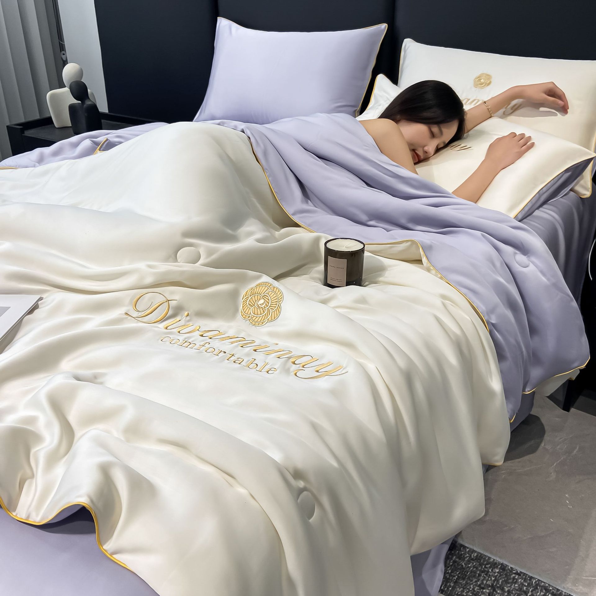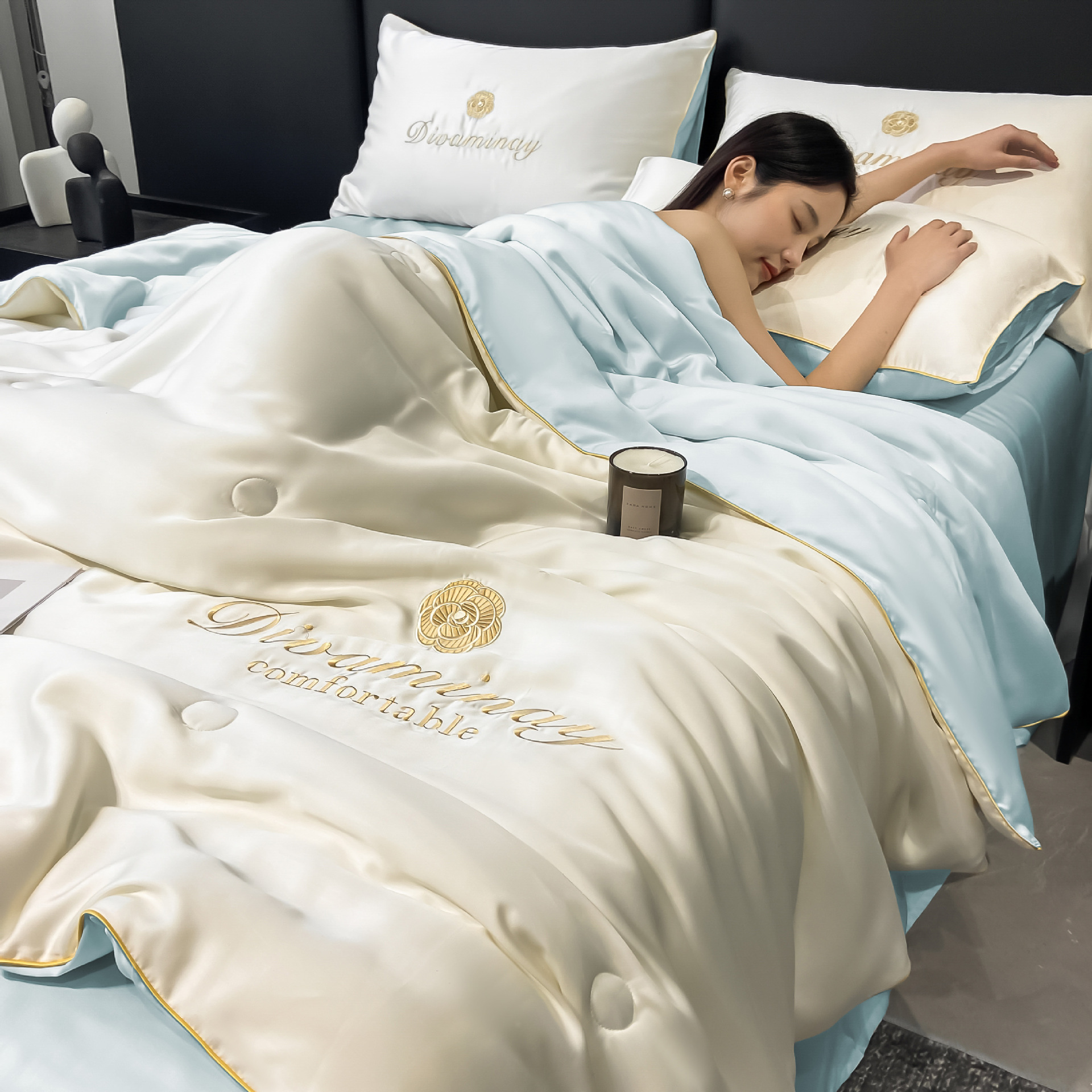 Four-piece ice silk summer cool quilt set, embroidered air-conditioned quilt, machine washable for naked sleep, modal washable Tencel summer quilt bedding