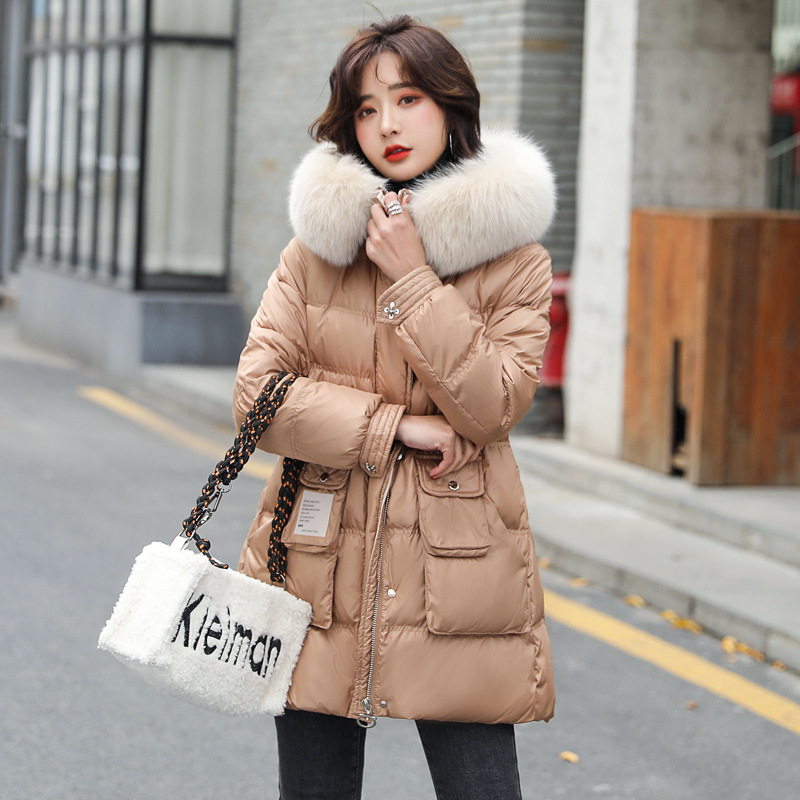 Fox fur down jacket for women, mid-length, 2020 winter new style, petite, waist-cinched, thickened, large fur collar white duck down coat