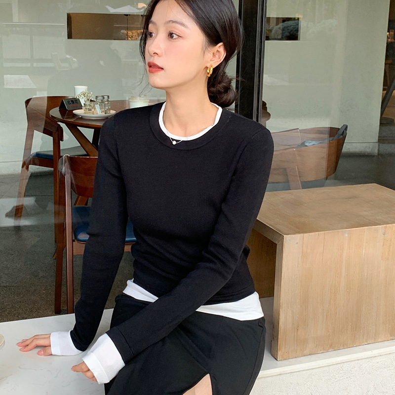 Free shipping, skin-friendly and anti-pilling 2024 autumn new short-sleeved fashionable layering fake two-piece base sweater knitted sweater