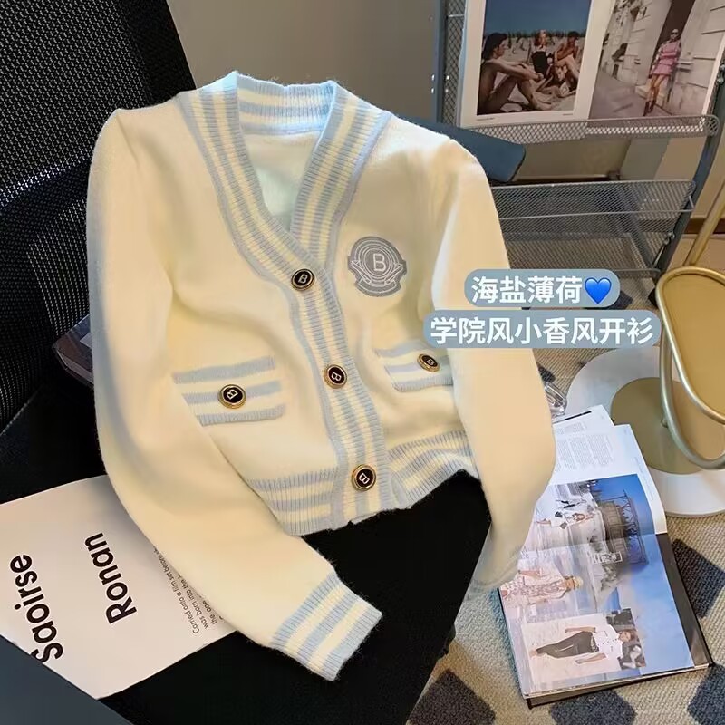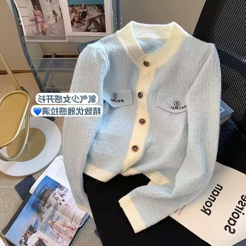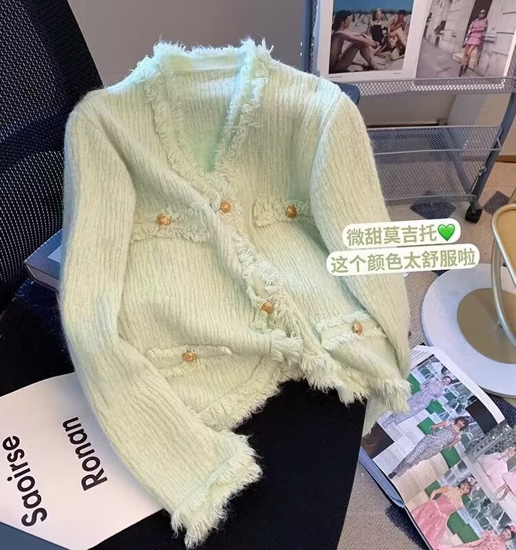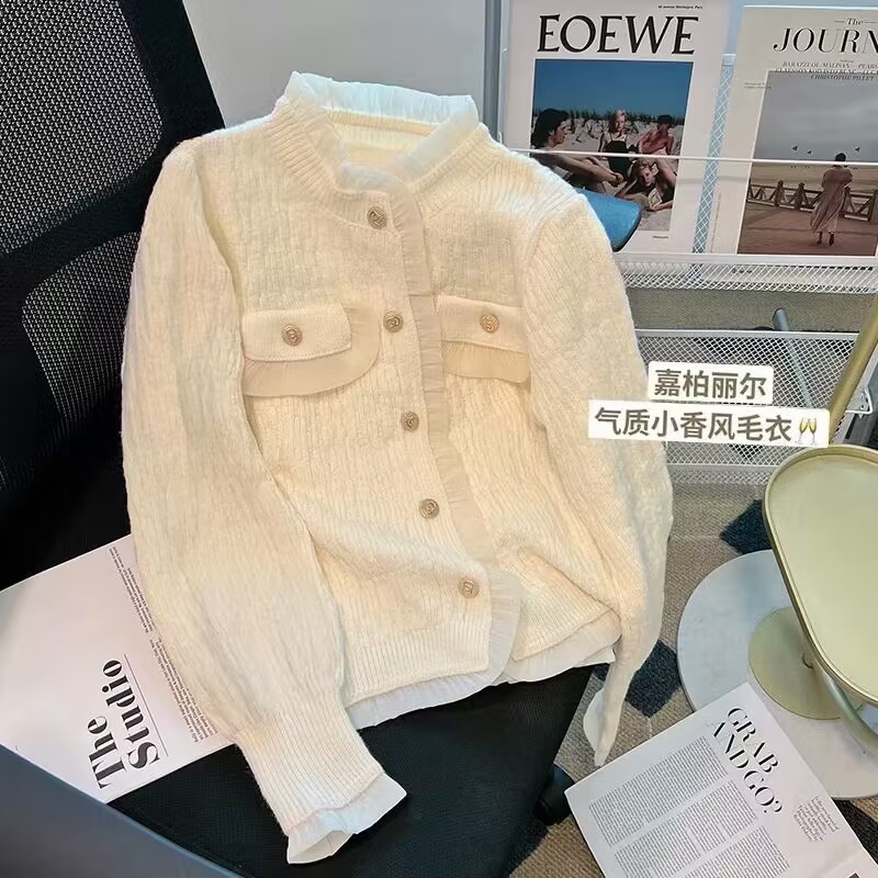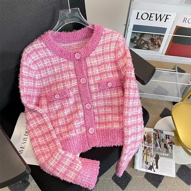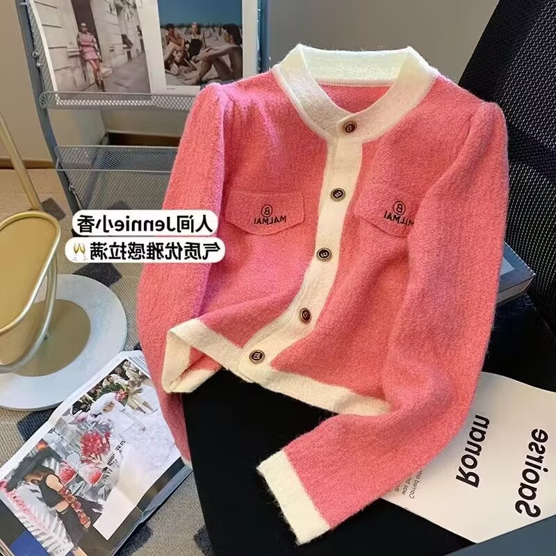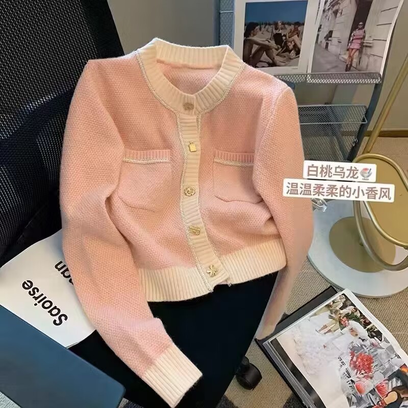 French chanel-style short knitted sweater for women to wear outside 2025 new product. A stylish socialite pairs it with a cardigan sweater for women's live streaming