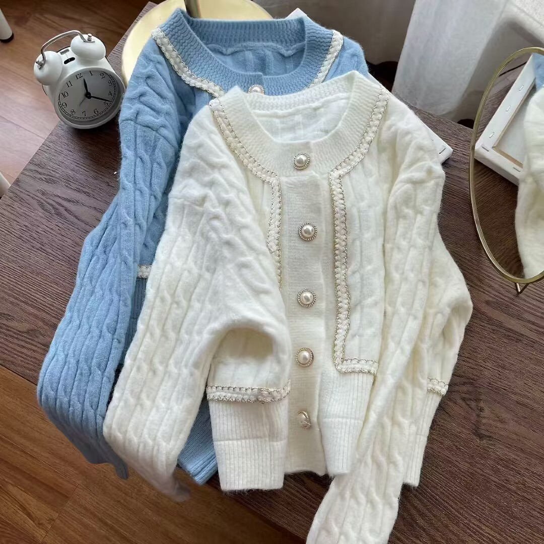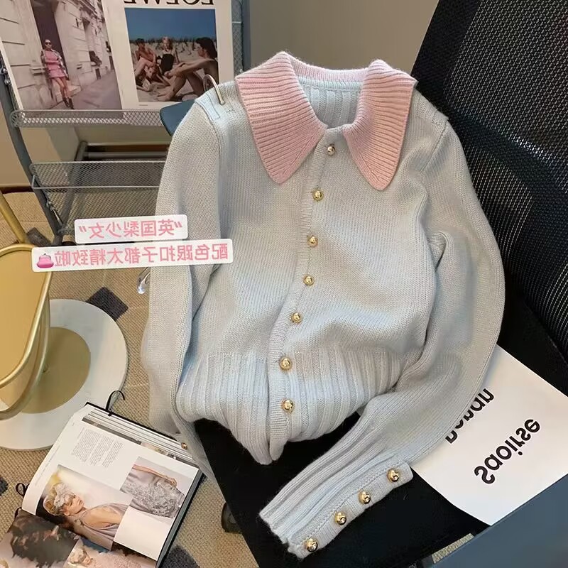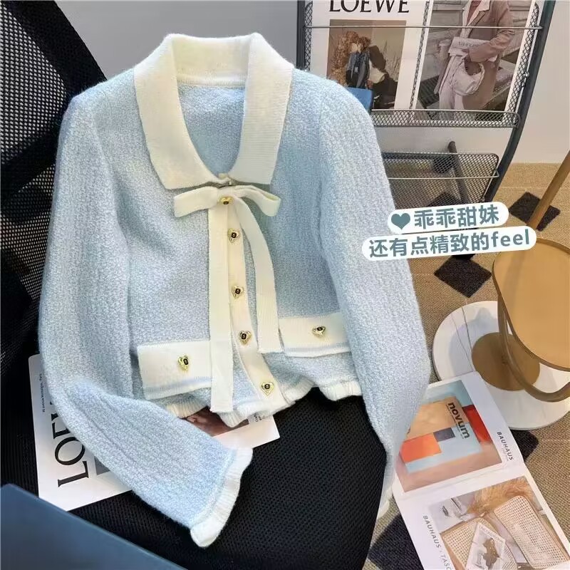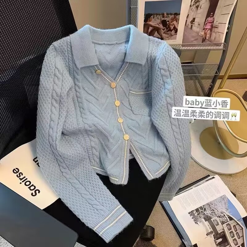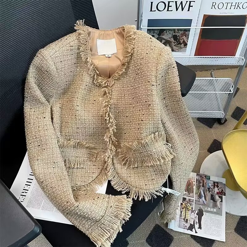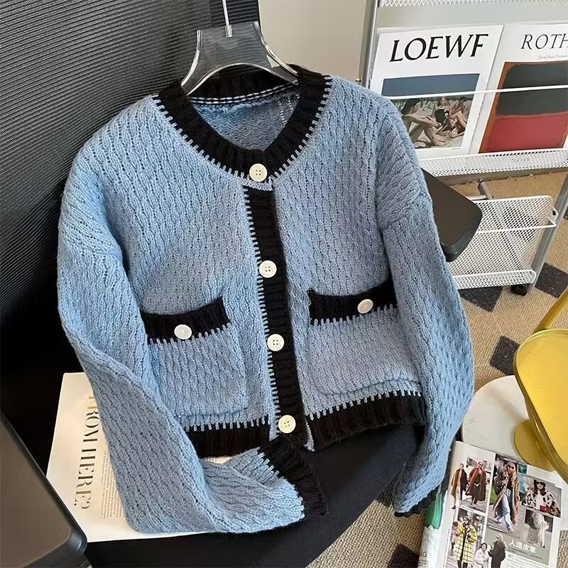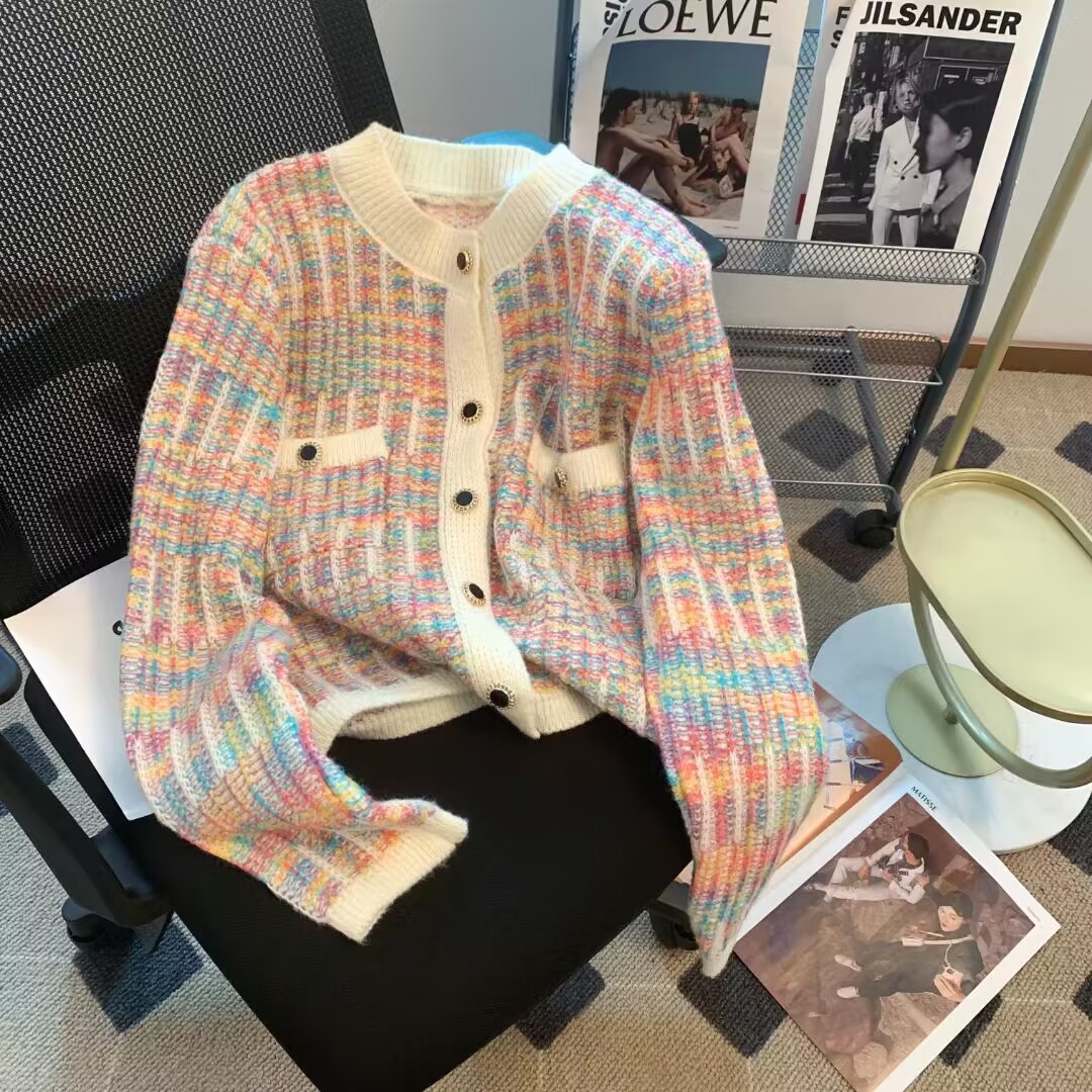 French chanel-style short knitted sweater for women to wear outside 2025 new product. A stylish socialite pairs it with a cardigan sweater for women's live streaming