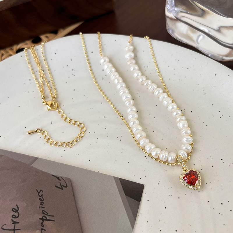 French red heart-shaped pearl necklace with a sweet atmosphere, Hepburn style retro double-layer freshwater pearl jewelry for women