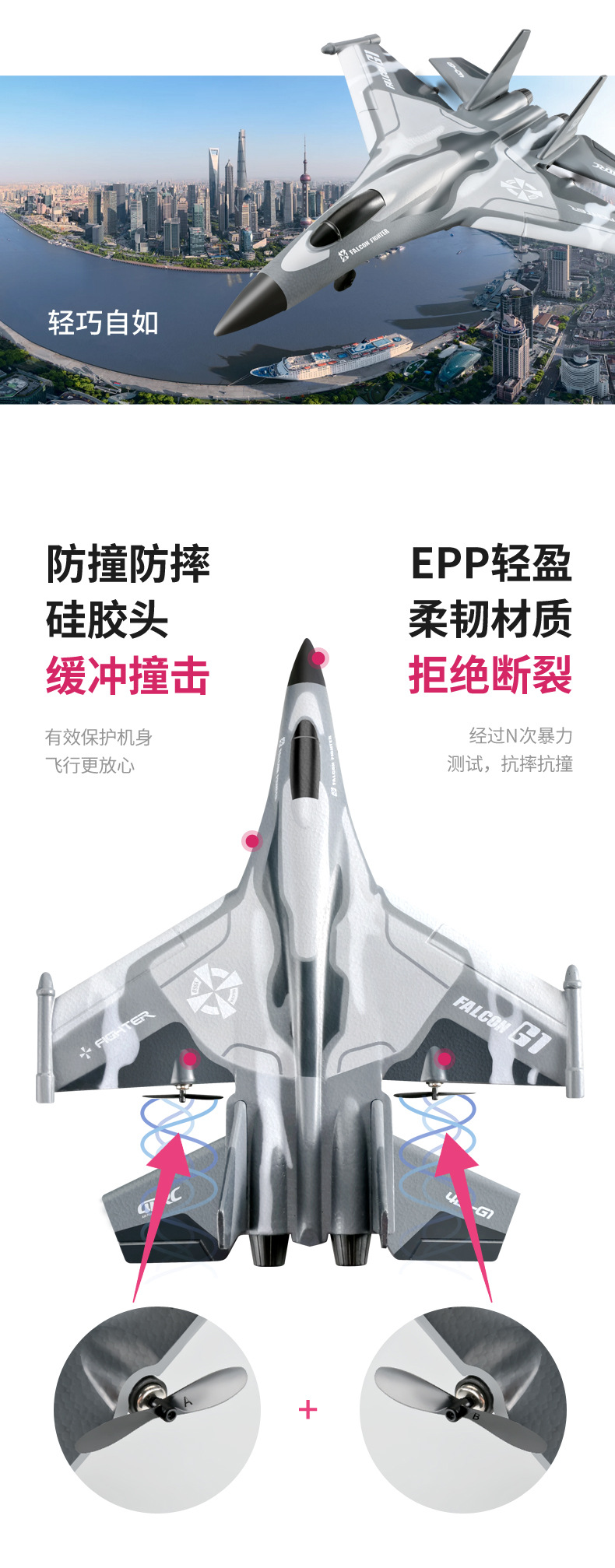 Made of EPP material, it is highly impact-resistant and weighs approximately 70g during flight.