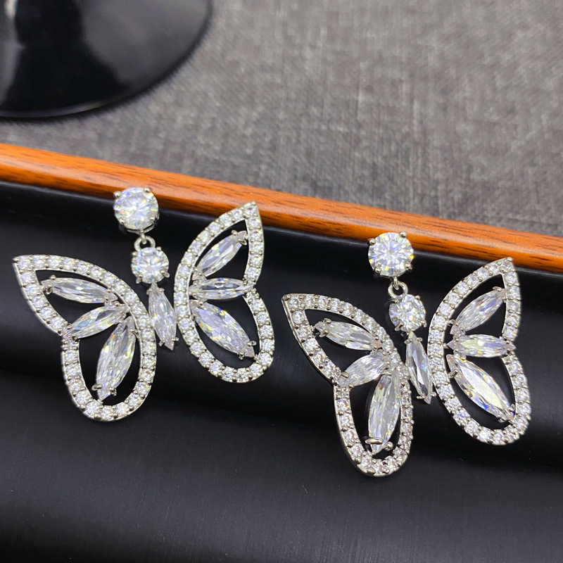 Geometric full zirconium hollowed-out heavy butterfly stud earrings, light luxury and elegant style earrings, bridal accessories for wedding parties