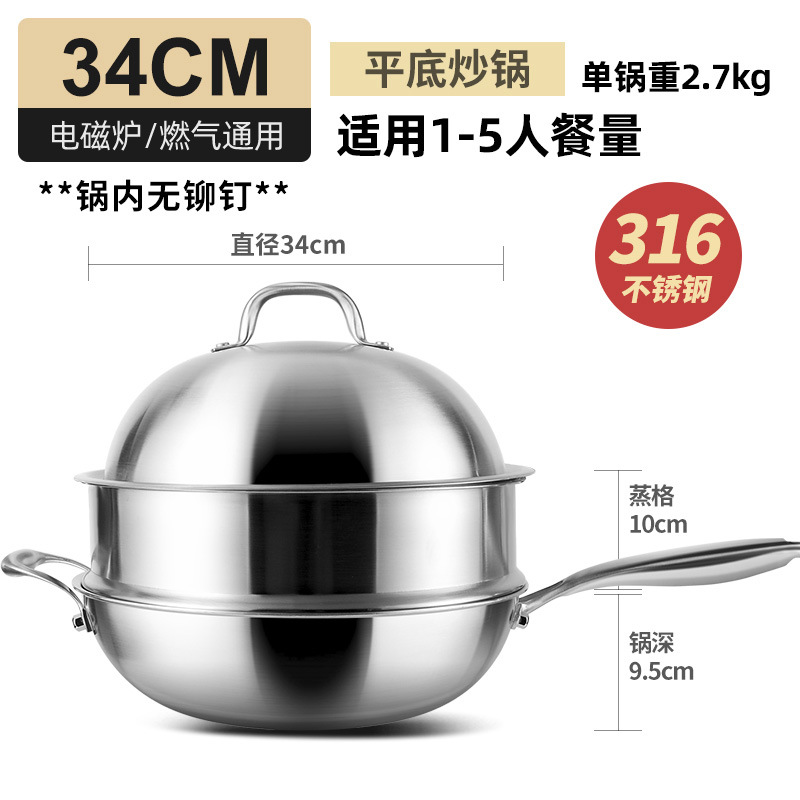 34cm flat bottom with lid + steaming rack [Uncoated 316 material]