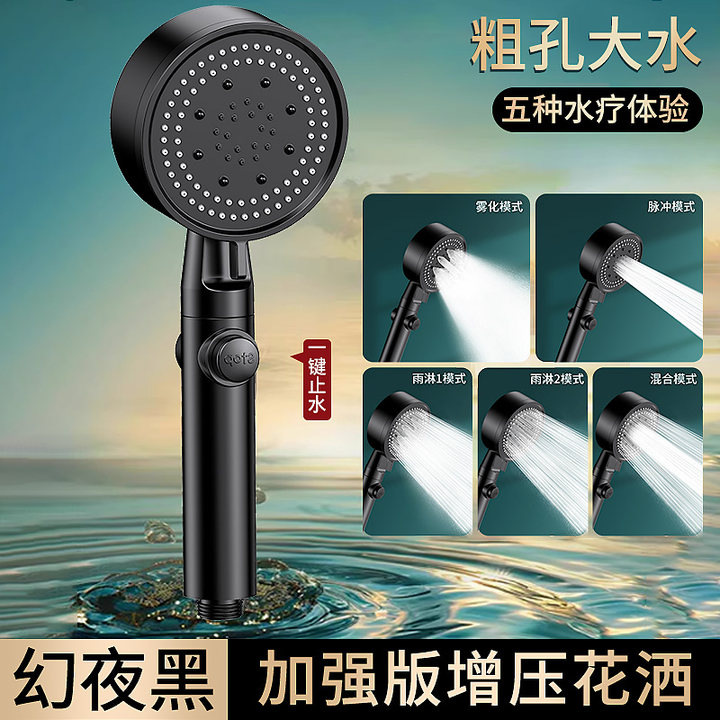 【 Phantom Night Black Set 3】 Pressurized showerhead + 1.5-meter Fine copper interface explosion-proof pipe