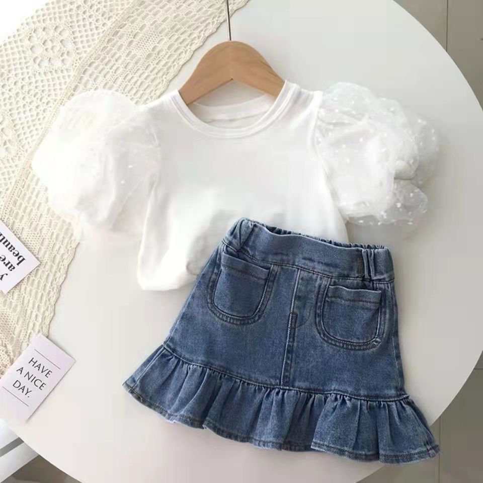 Pure cotton bubble short-sleeved shirt + denim skirt