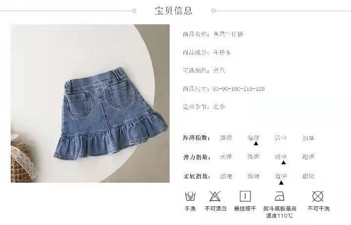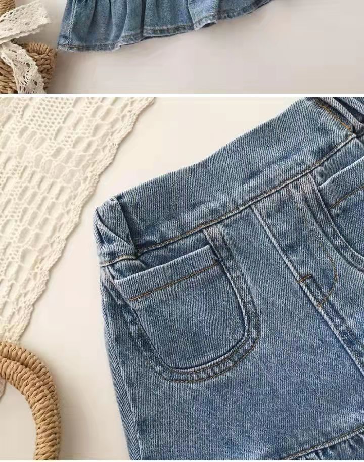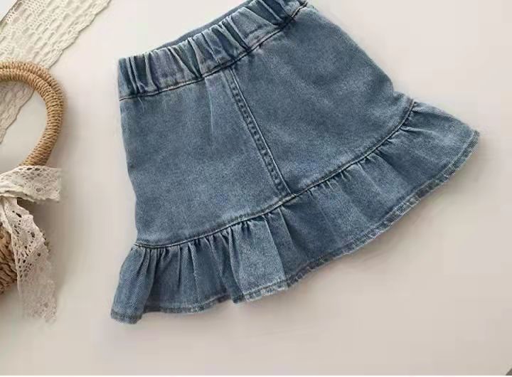 Girls' half-length denim skirt 2023 new summer baby short skirt with ruffled edges, children's hip-hugging skirt, fishtail skirt, trendy