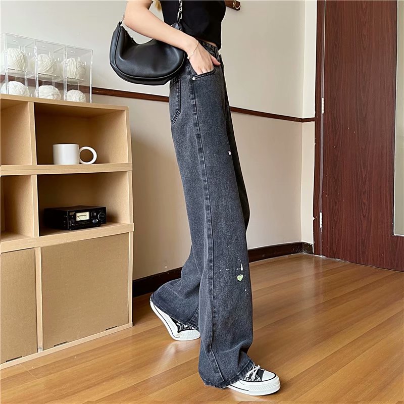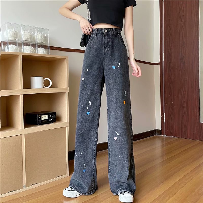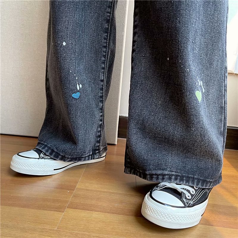 Graffiti heart-shaped jeans, women's wide-leg pants, high-waisted straight-leg pants, slimming and versatile loose floor-length pants, ins trend