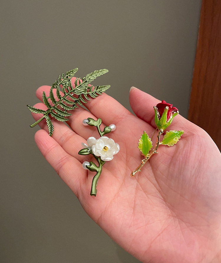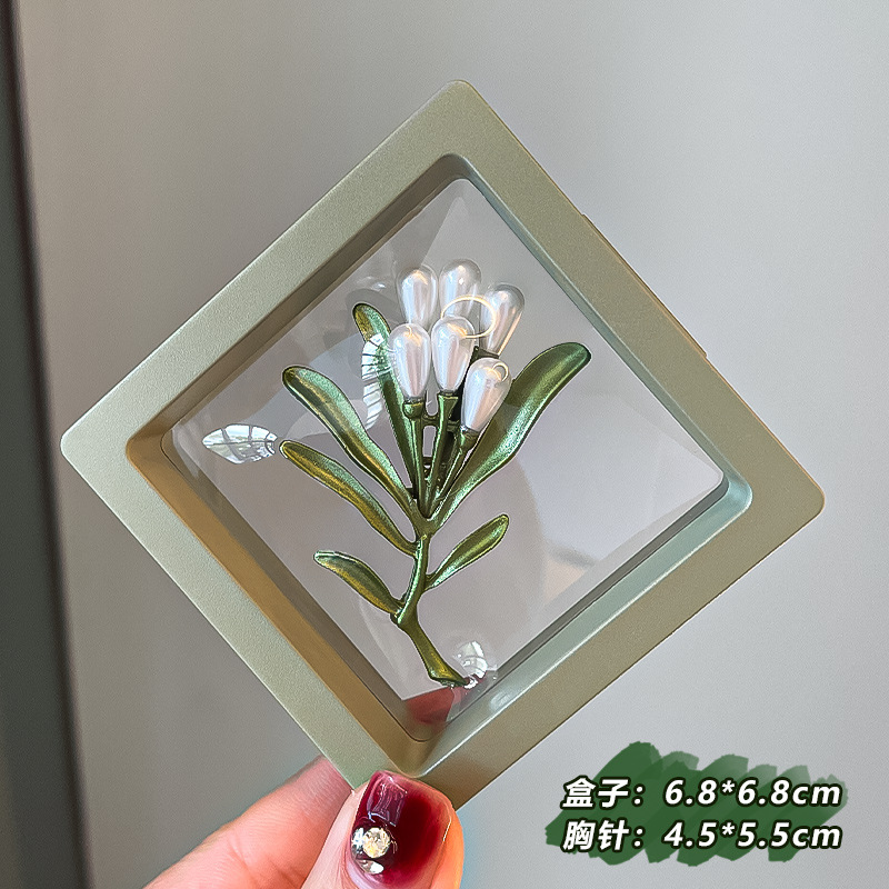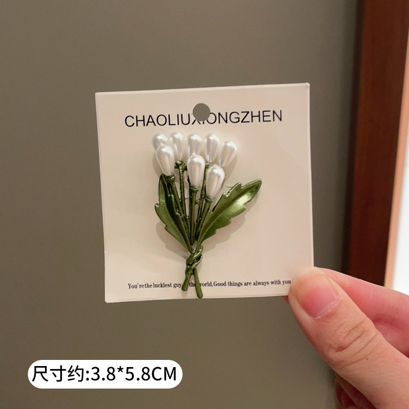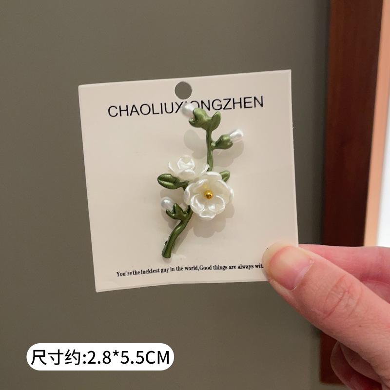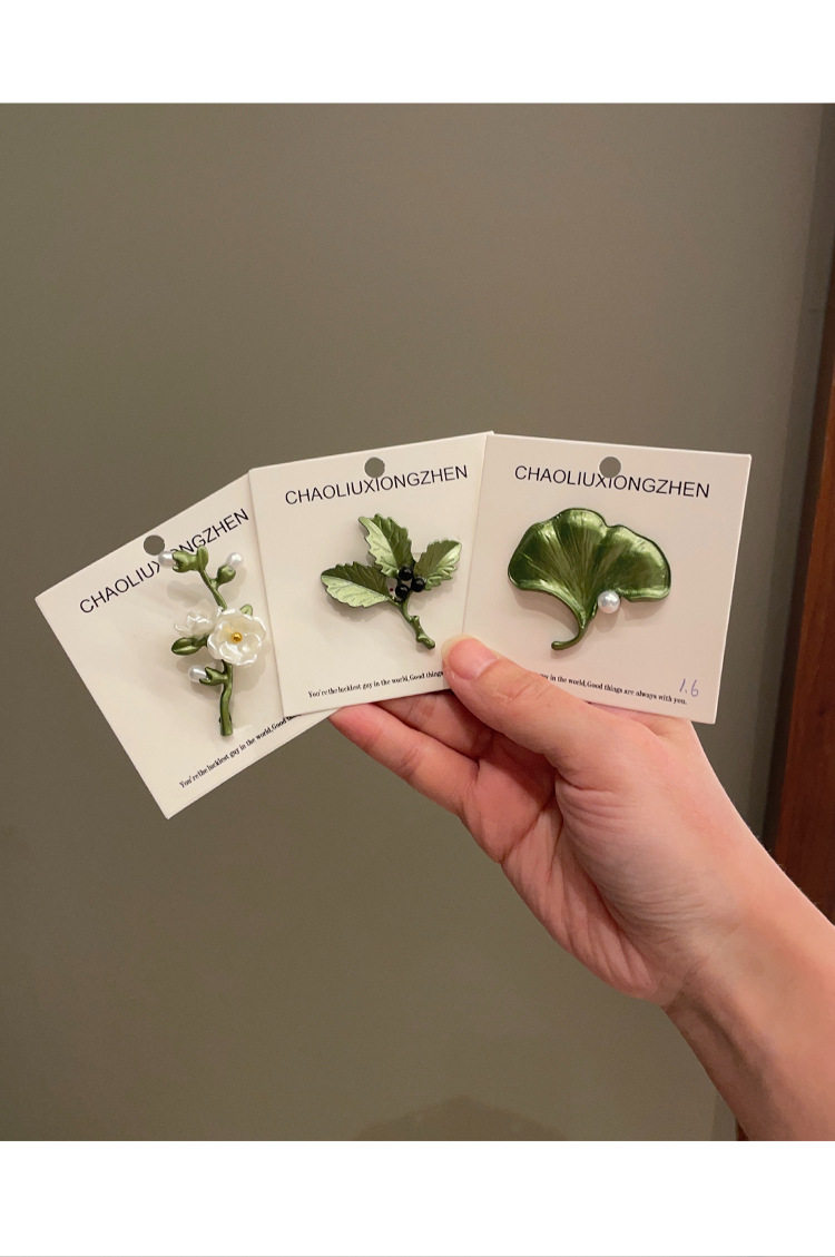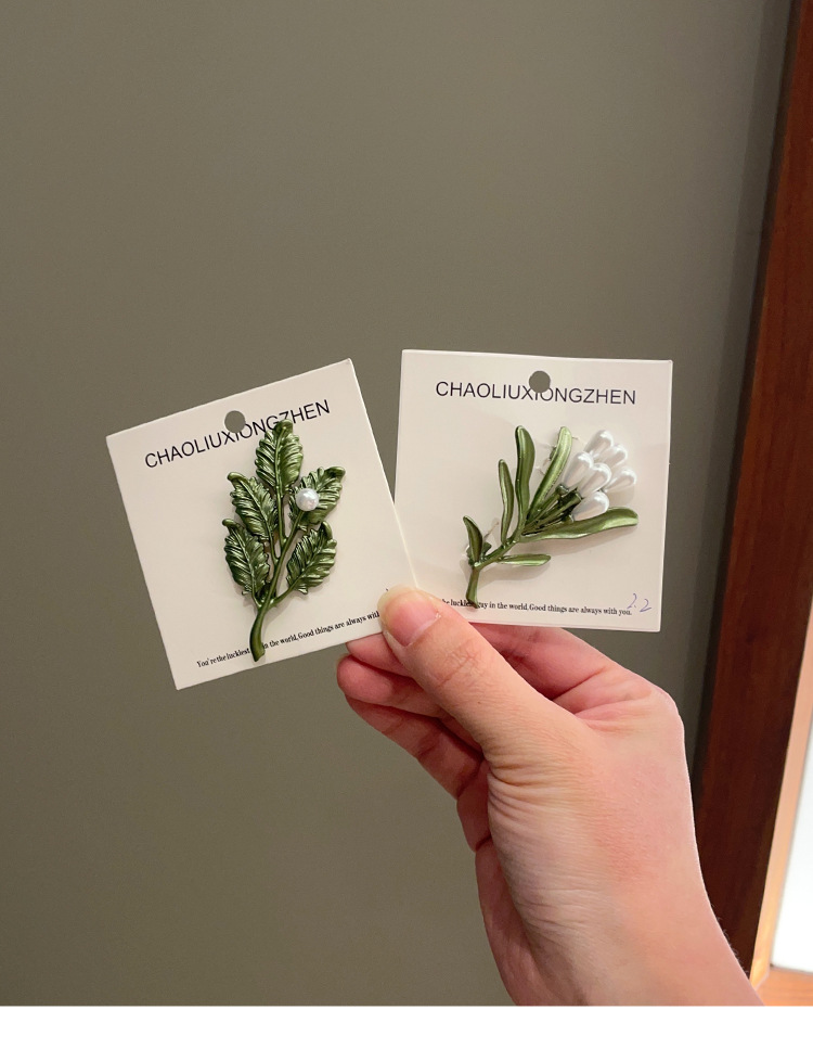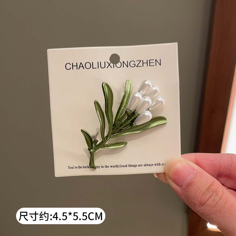 Green plant flower brooch, pearl anti-glare pin accessory, high-end women's fresh and delicate suit brooch decoration