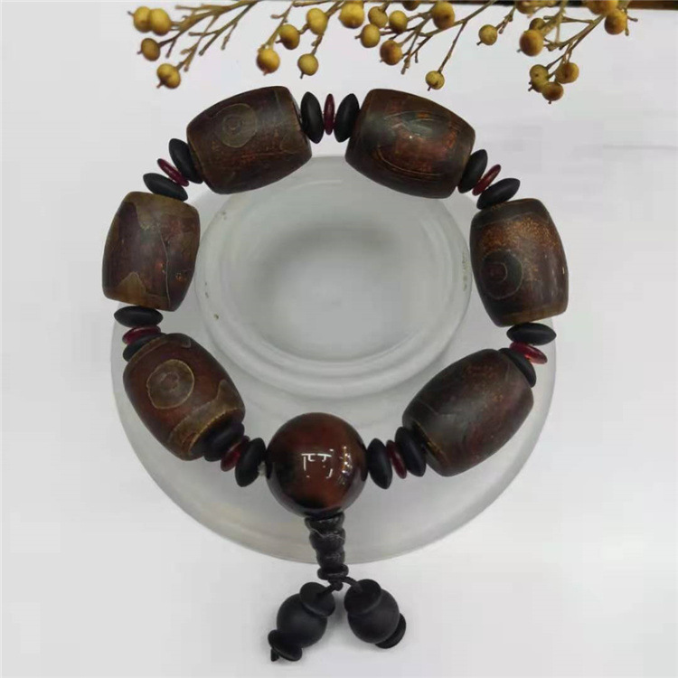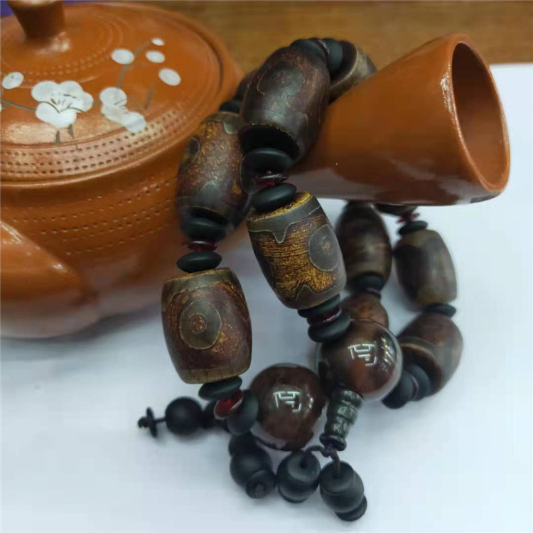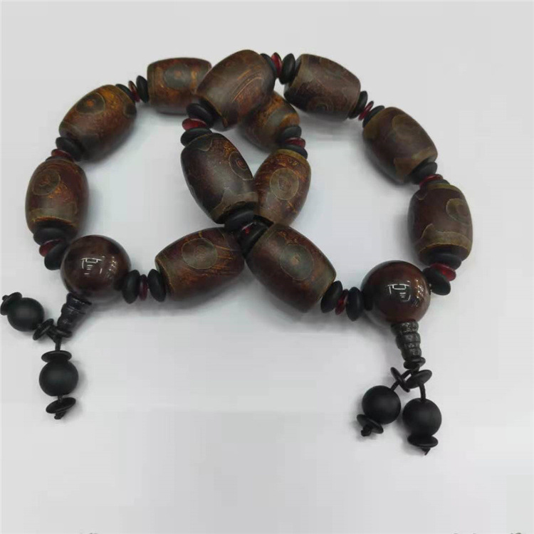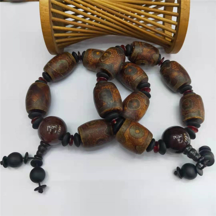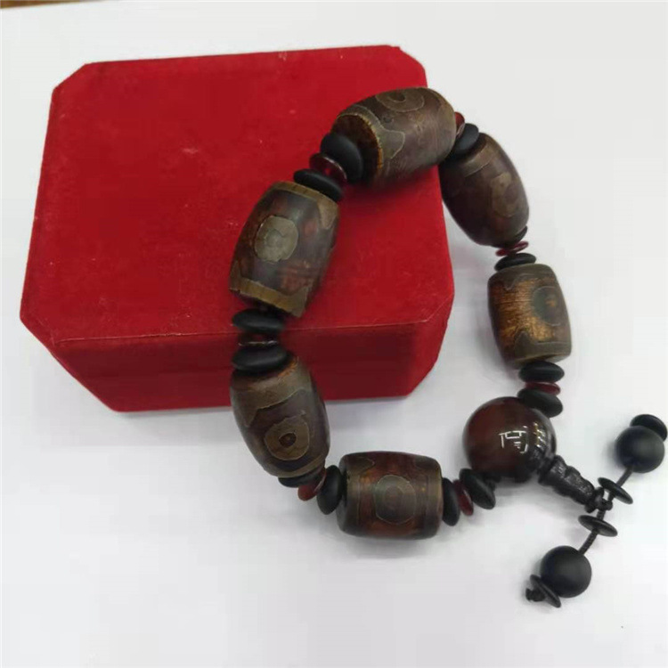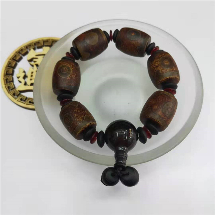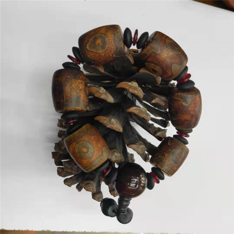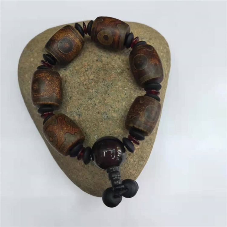 The earliest natural dzi beads were made by polishing conch fossils. Later, due to the scarcity of fossils, the ancient Tibetans began to use a sedimentary rock containing jade and agate components to polish dzi beads. This sedimentary rock has a very strong magnetic field, and the naturally formed regular patterns are mainly eyeballs, supplemented by triangles, quadrilaterals, etc.