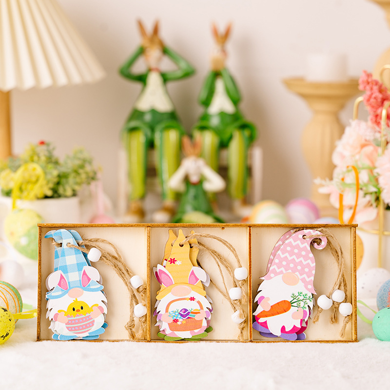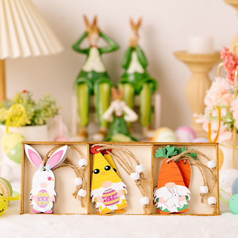 Hao Bei Cross-border's new Easter decorative items 3-compartment wooden box, wooden radish dwarf pendant, exquisite handicraft, essential for festive atmosphere decoration
