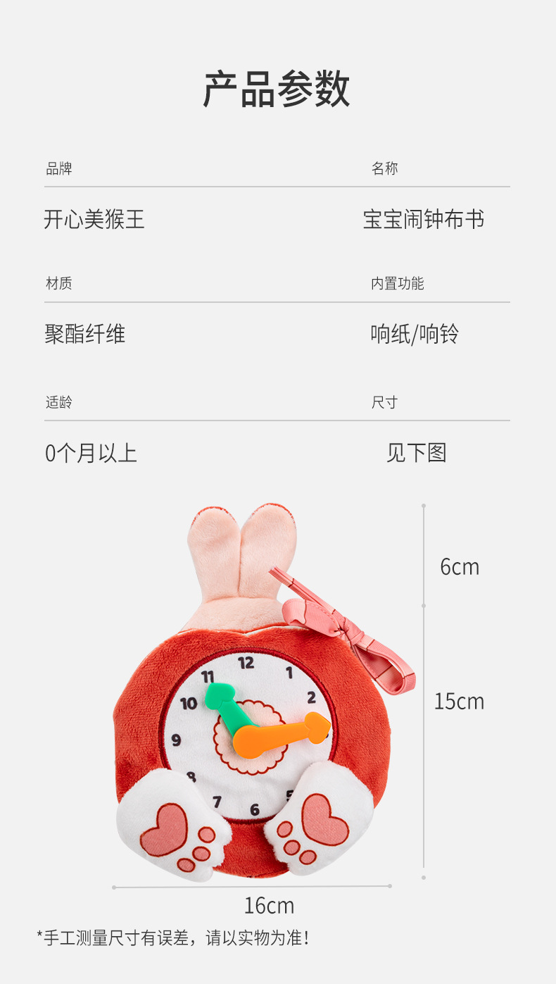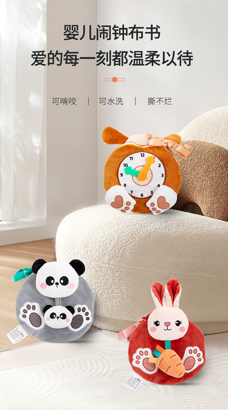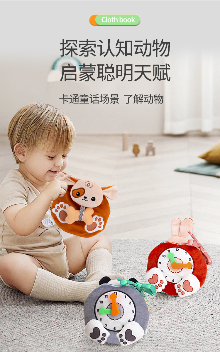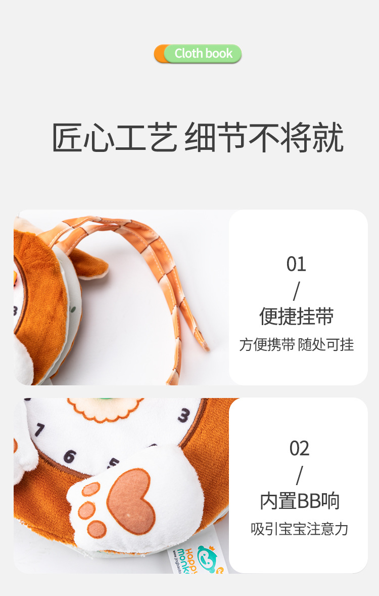 Happy monkey, unbreakable Early Education and Intelligence 3D Cloth Book, baby's cognitive plush animal toy with alarm clock