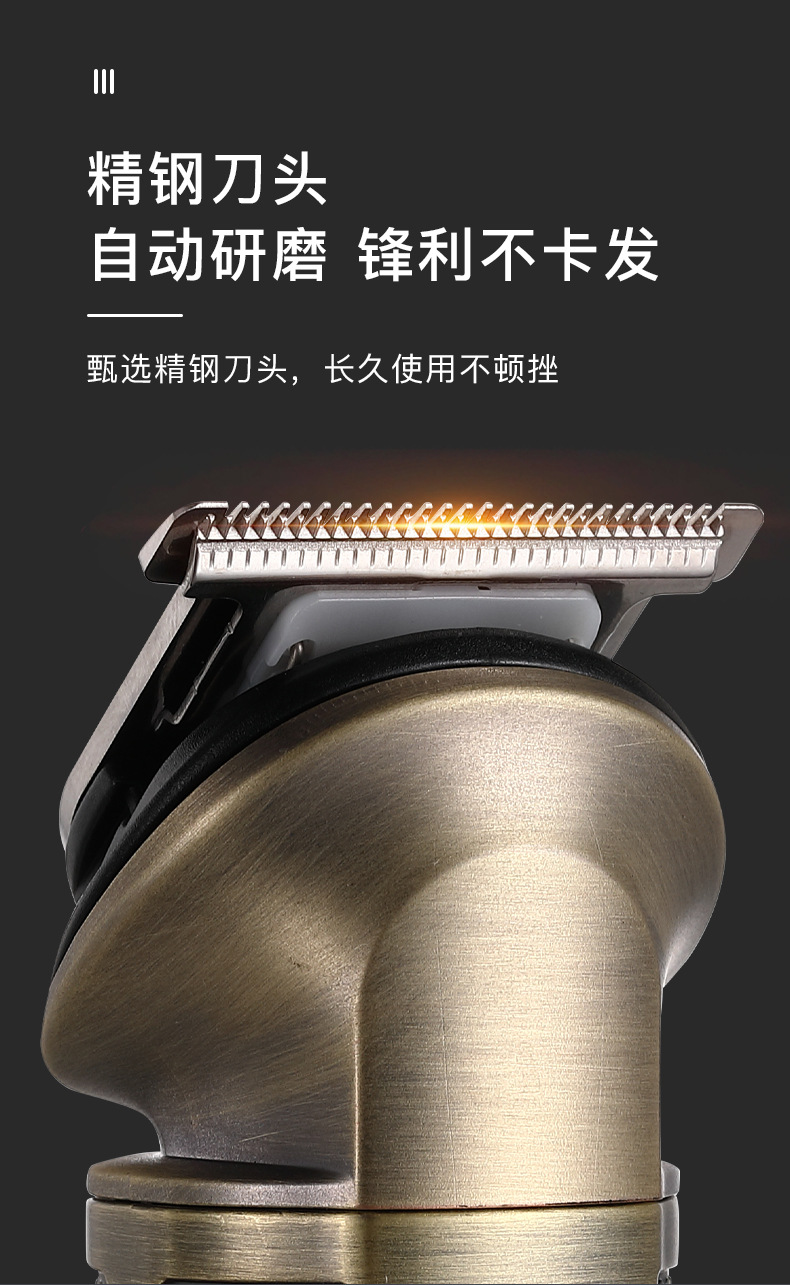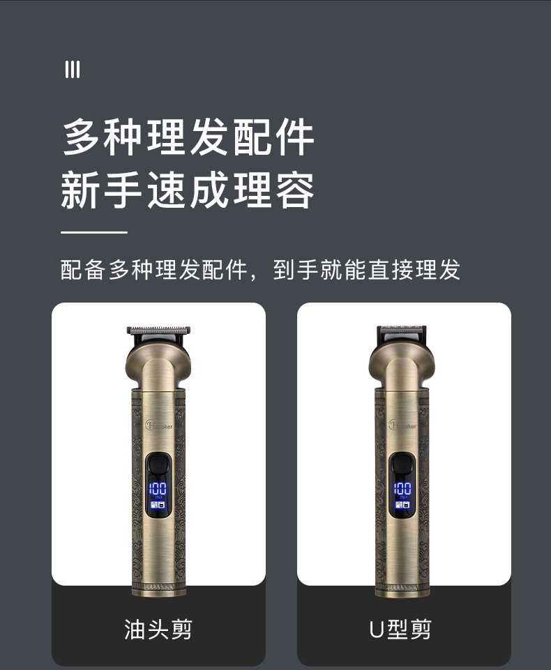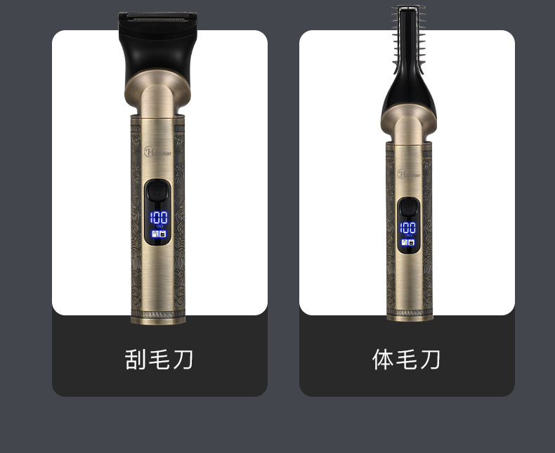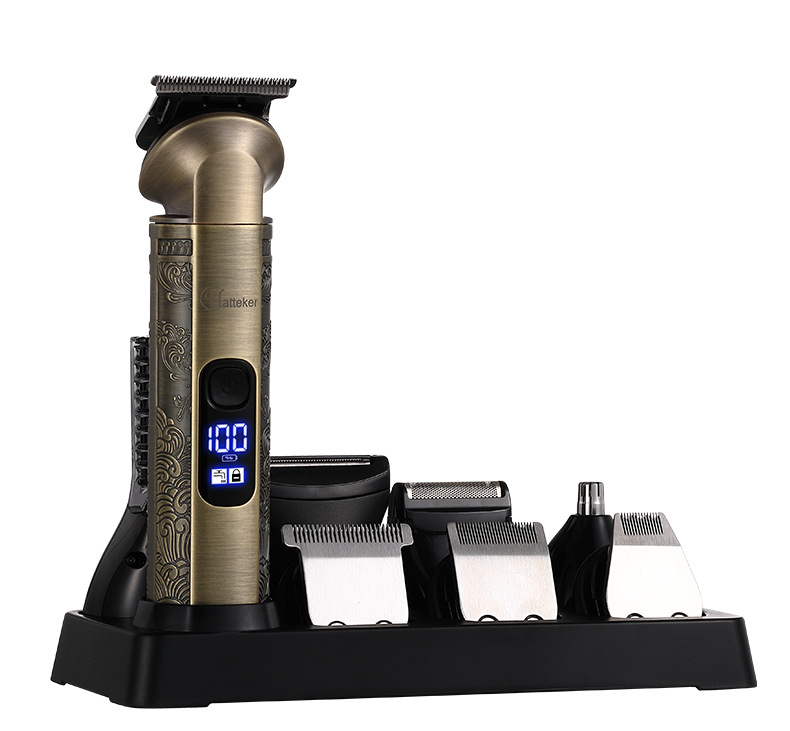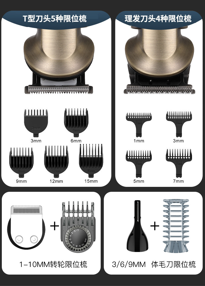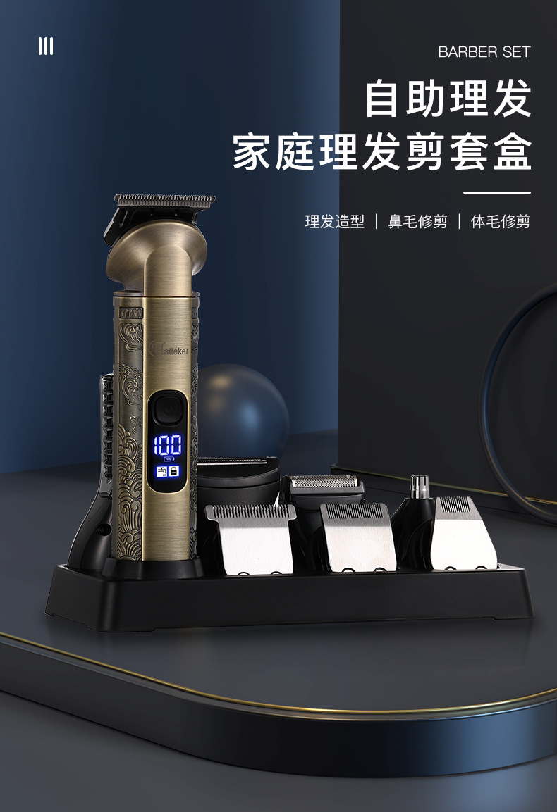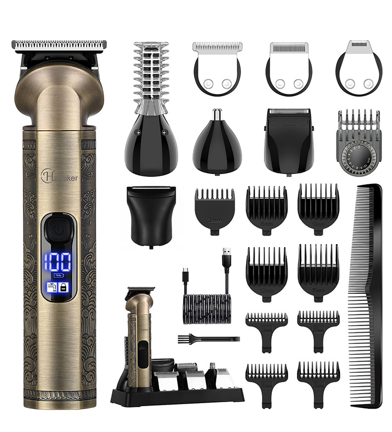 Product features: Multi-functional eight-in-one set, metal body, LCD digital battery level display, R-corner protective blade head design, low vibration and low noise, dual-purpose charging and plug-in, comfortable hand feel, strong power, long battery life, suspended stand design, retro oil head engraving, zero blade head can shave the head, and the whole body can be washed with water
