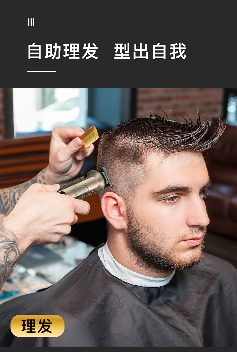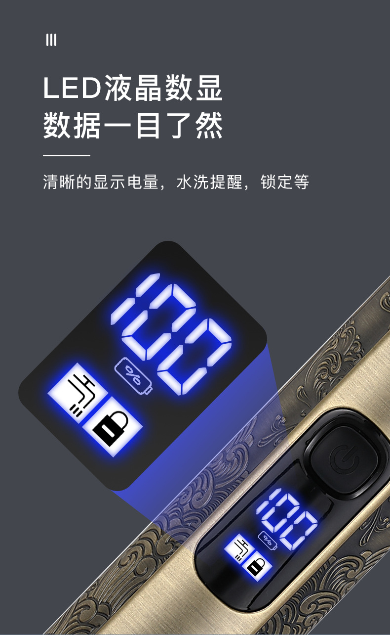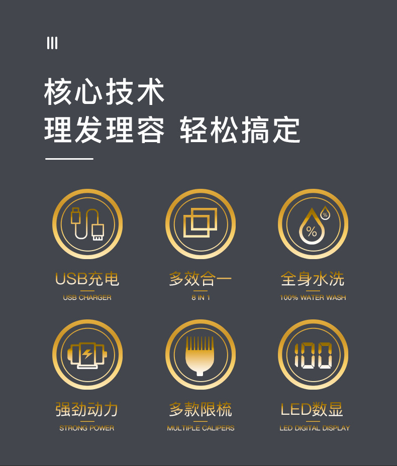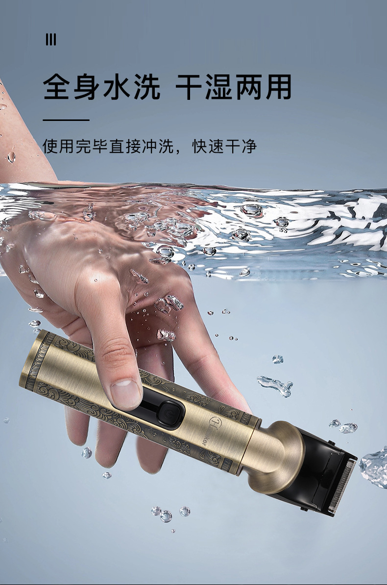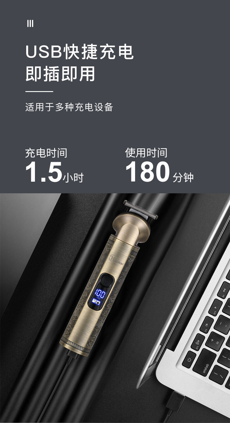 Product features: Multi-functional eight-in-one set, metal body, LCD digital battery level display, R-corner protective blade head design, low vibration and low noise, dual-purpose charging and plug-in, comfortable hand feel, strong power, long battery life, suspended stand design, retro oil head engraving, zero blade head can shave the head, and the whole body can be washed with water