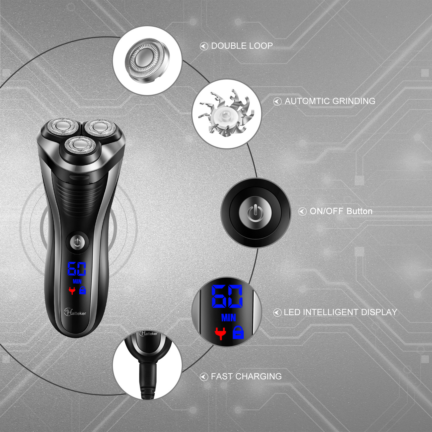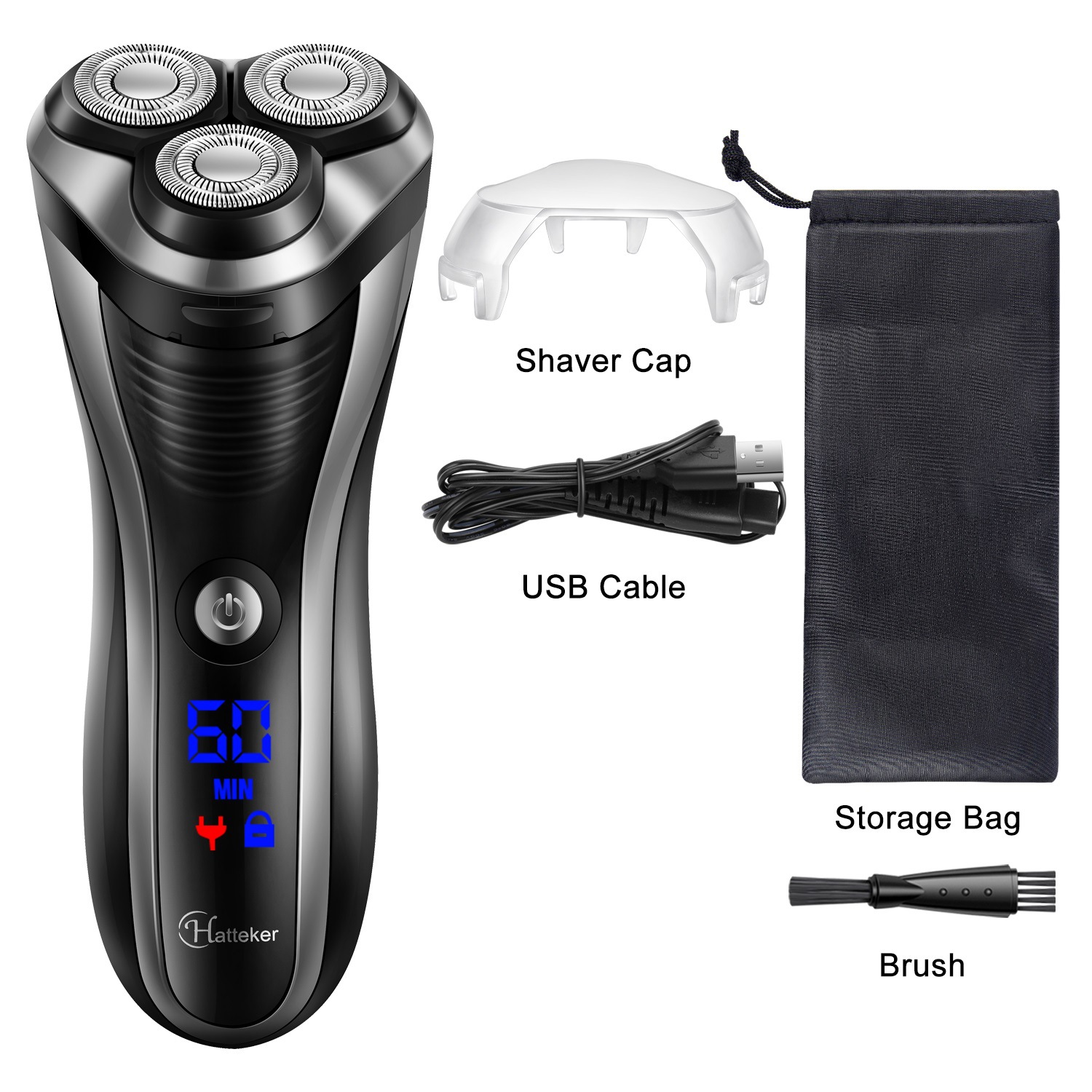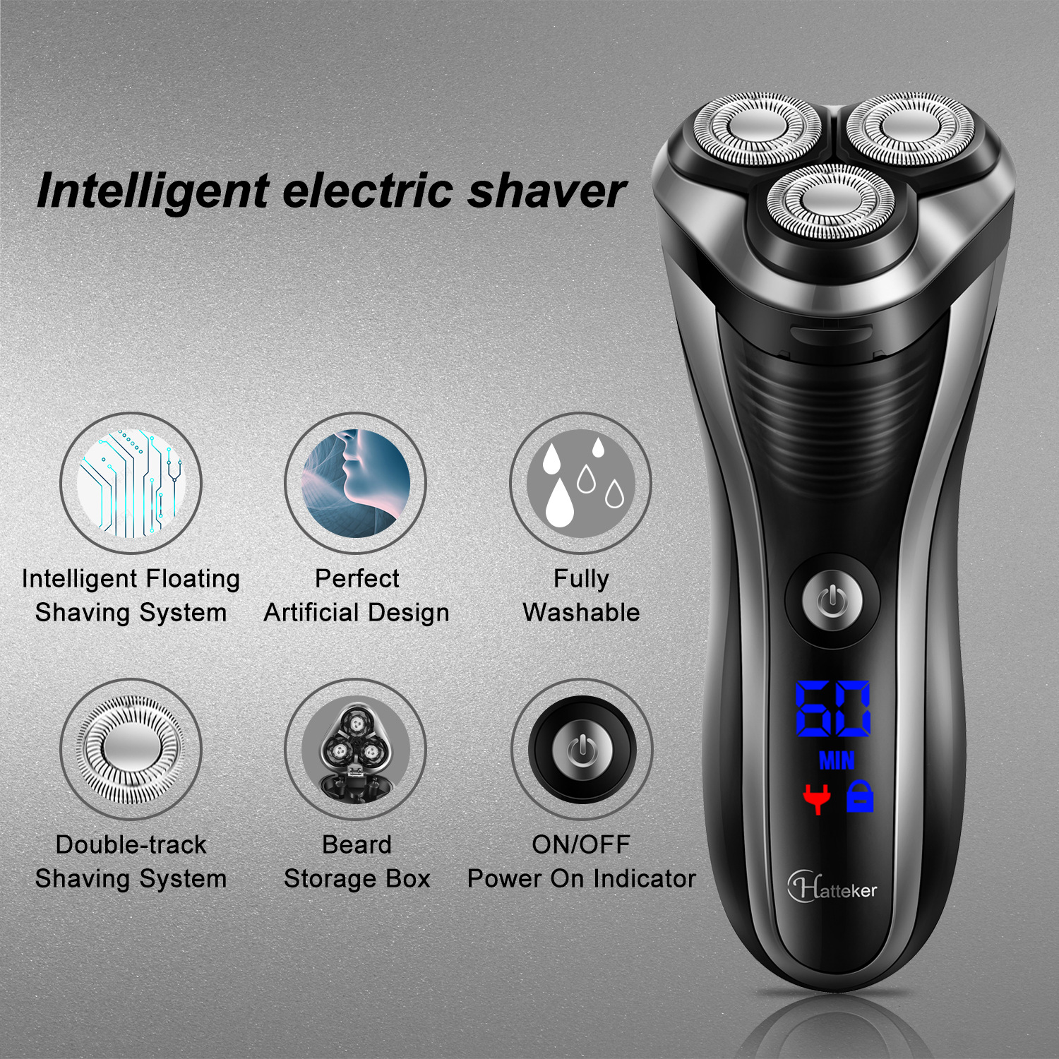 HATTEKER men's electric shaver, LCD digital display, portable razor, highly waterproof, can be fully washed with water to clean the beard