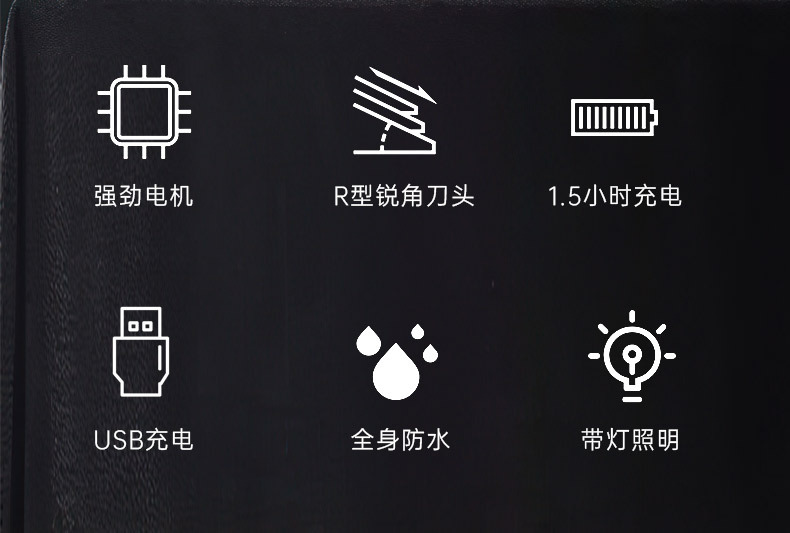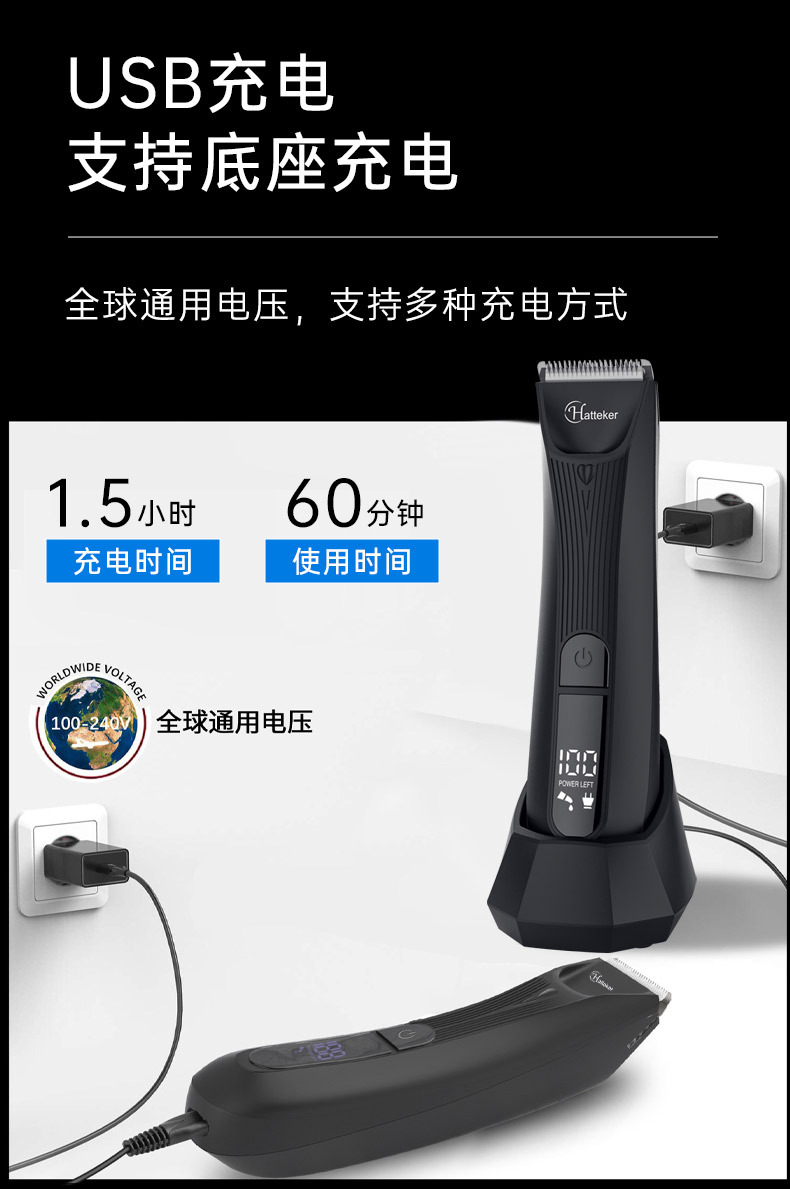 Basic configuration: main unit, USB charging cable, limit comb (3.9mm), removable charging base, lubricating oil, cleaning brush, foreign language instruction manual