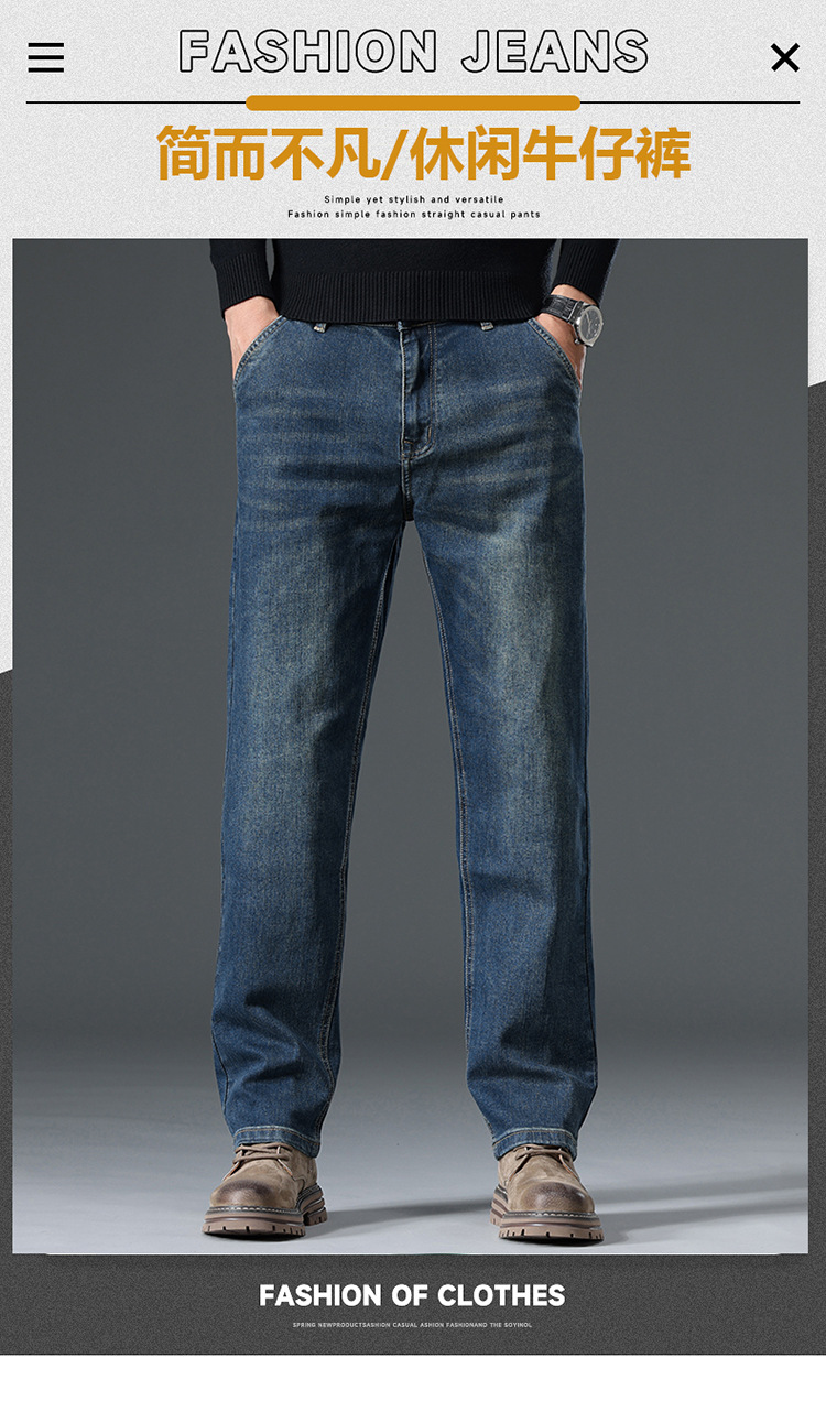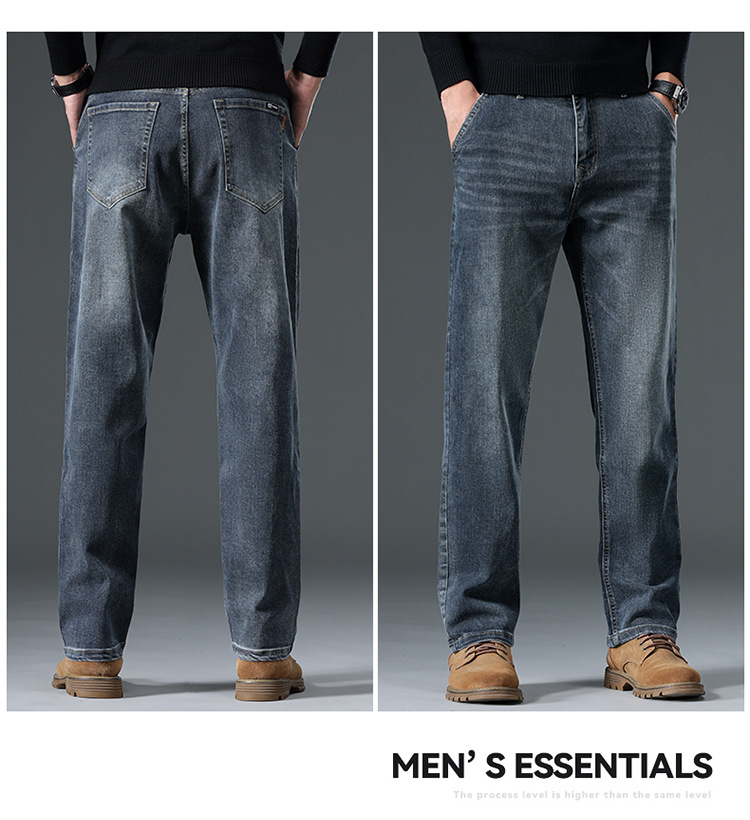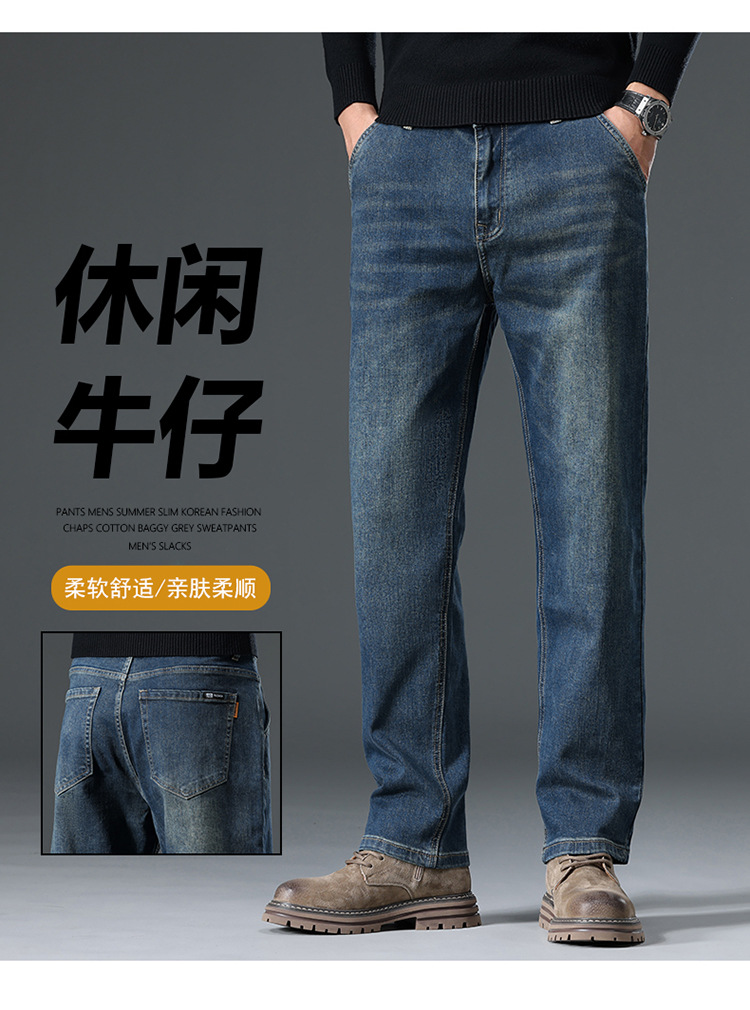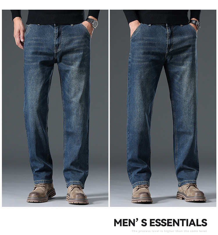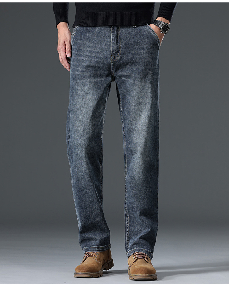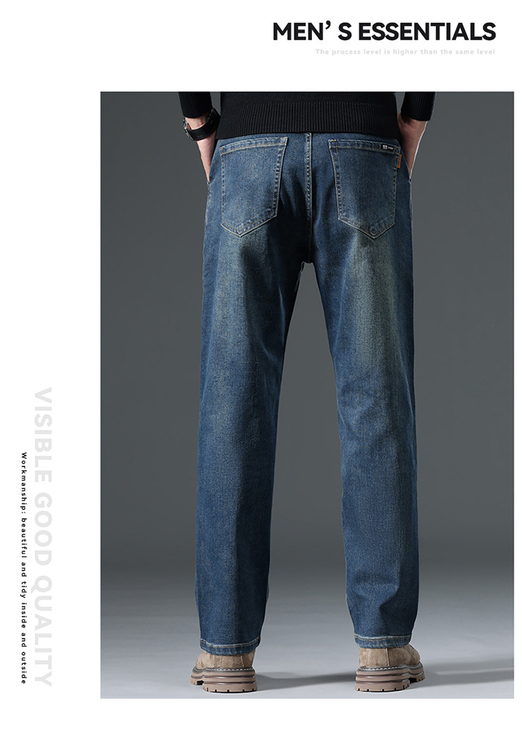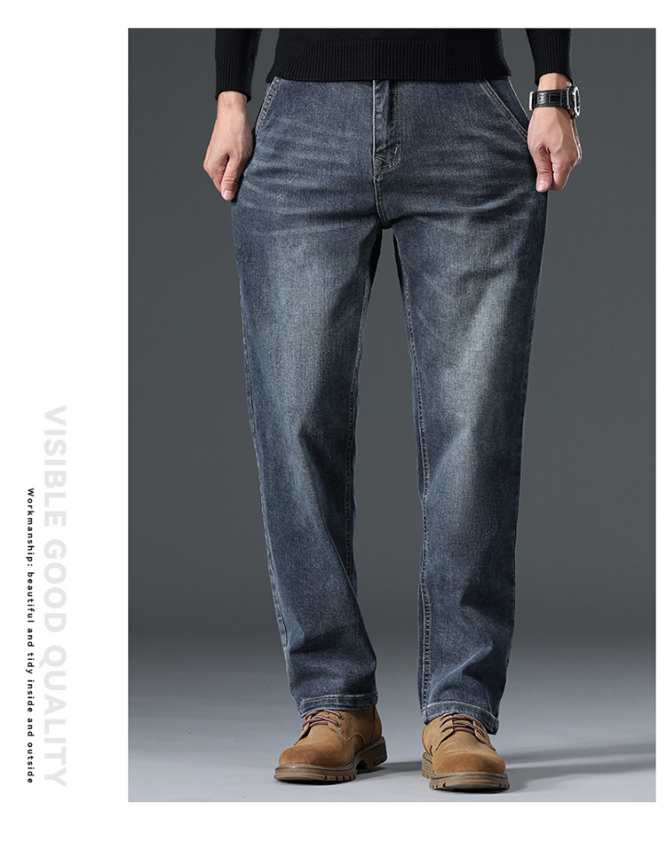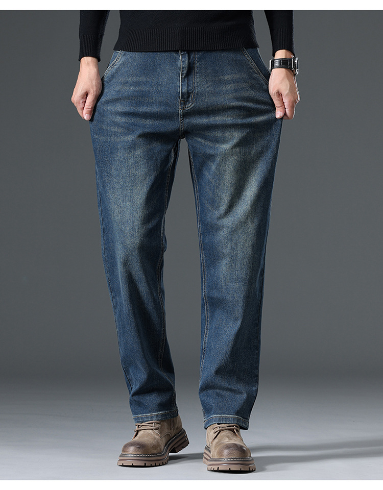 High-end cotton straight-leg jeans with fleece loose, casual and versatile men's trousers for autumn and winter, new stretch casual pants