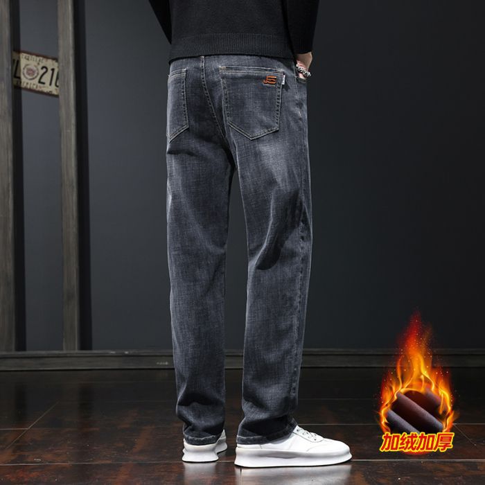 High-end light luxury men's jeans for autumn and winter, loose straight-leg, fleece and thickened stretch casual trousers