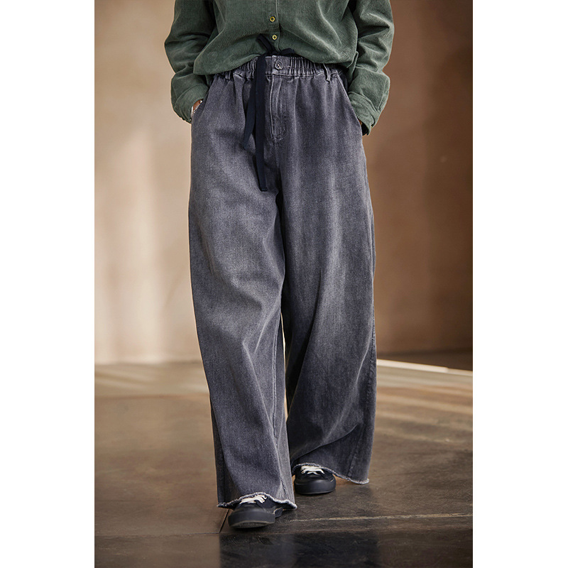 High-end, niche, artistic and retro, all-season wearable smoke grey retro tight-waisted wide-leg stray jeans for women
