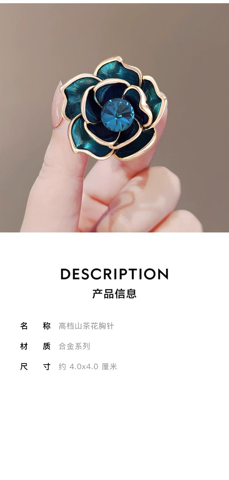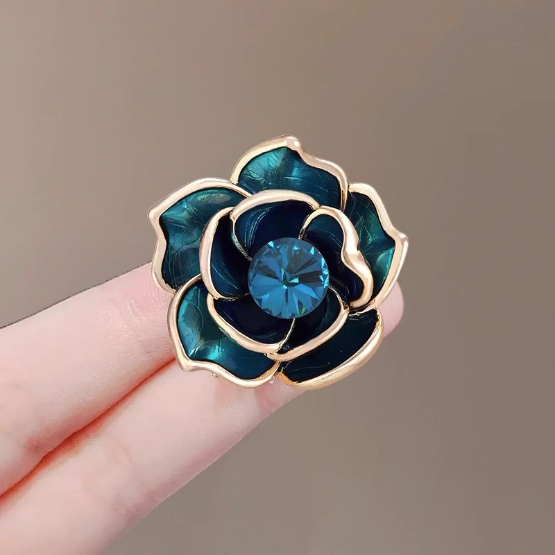 High-end peacock blue camellia brooch, women's luxurious and elegant enamel oil drip brooch, chanel-style clothing accessories