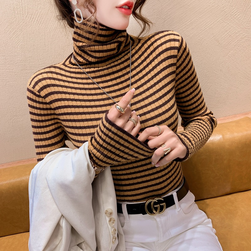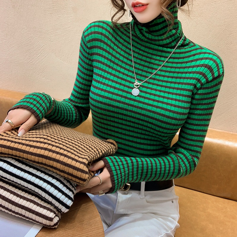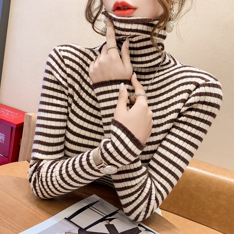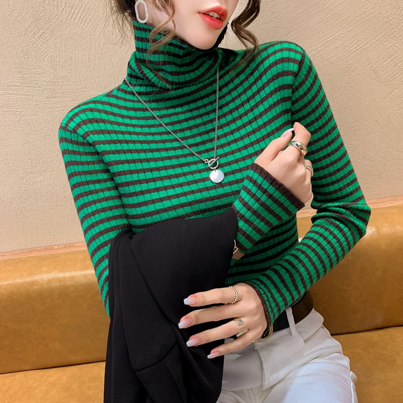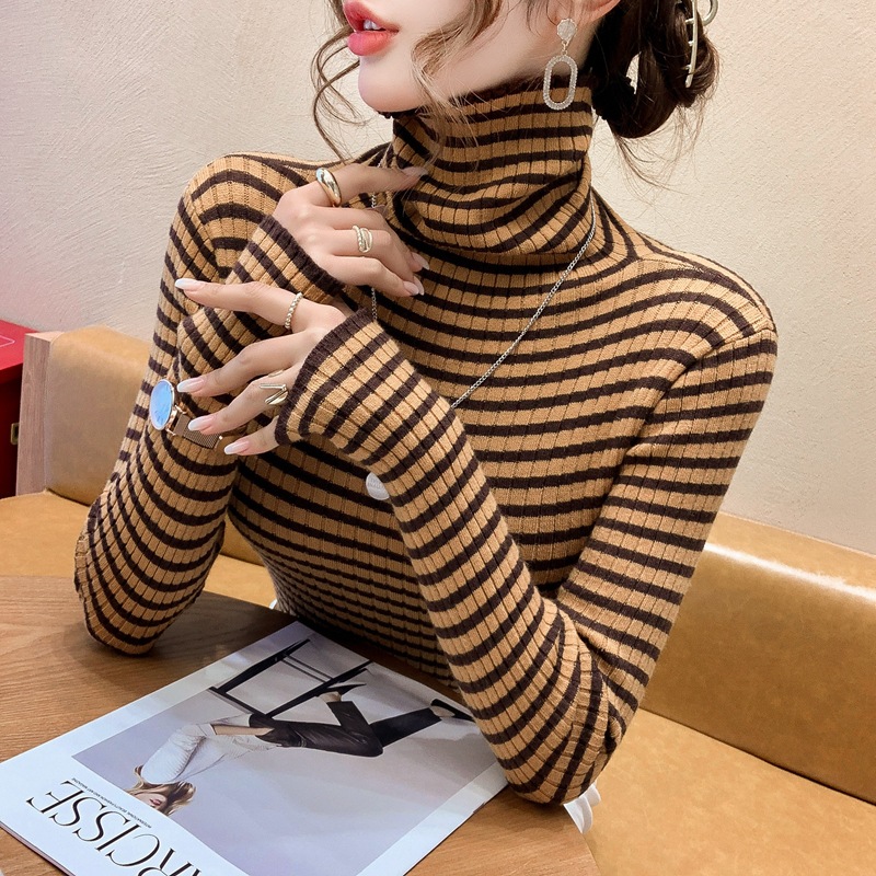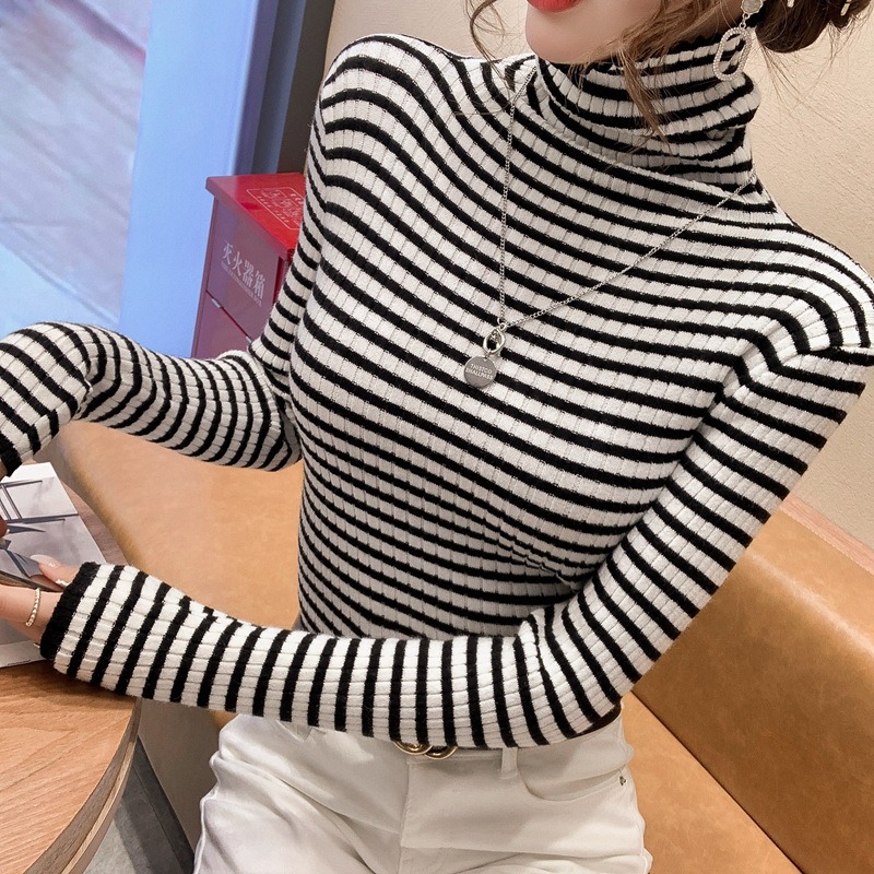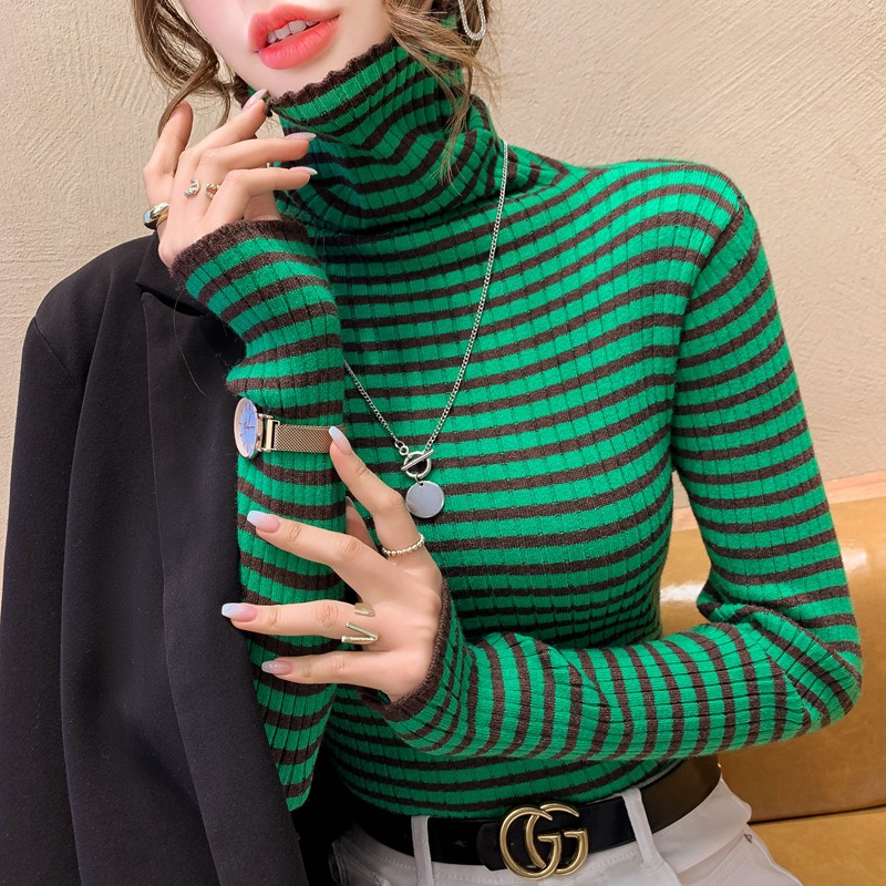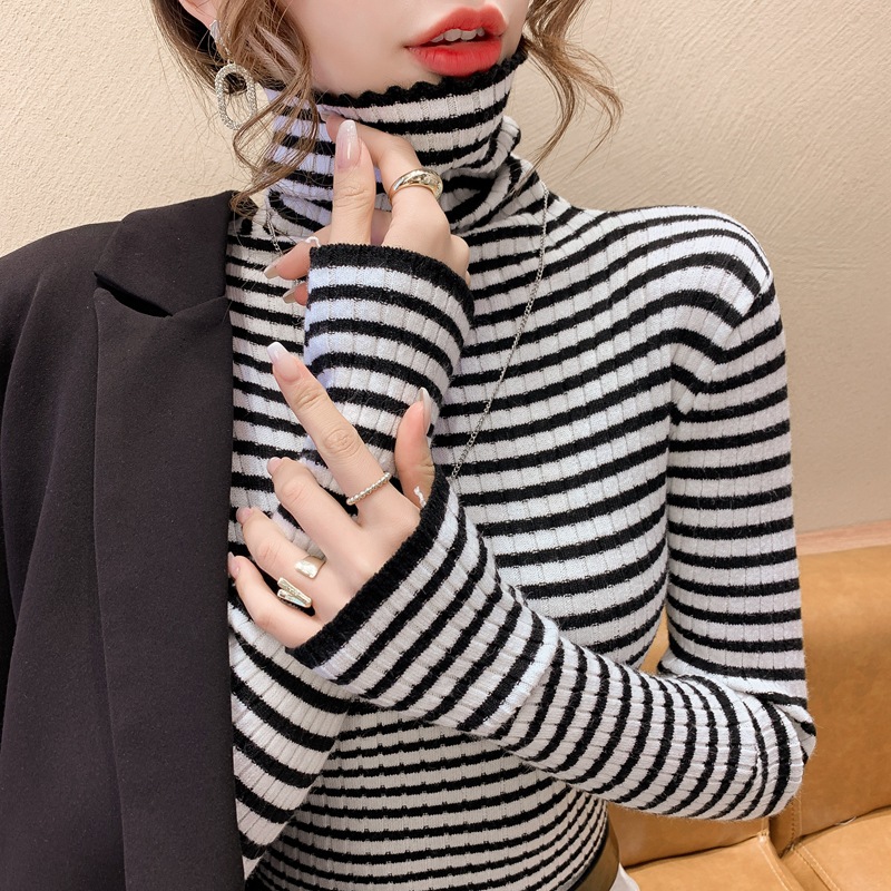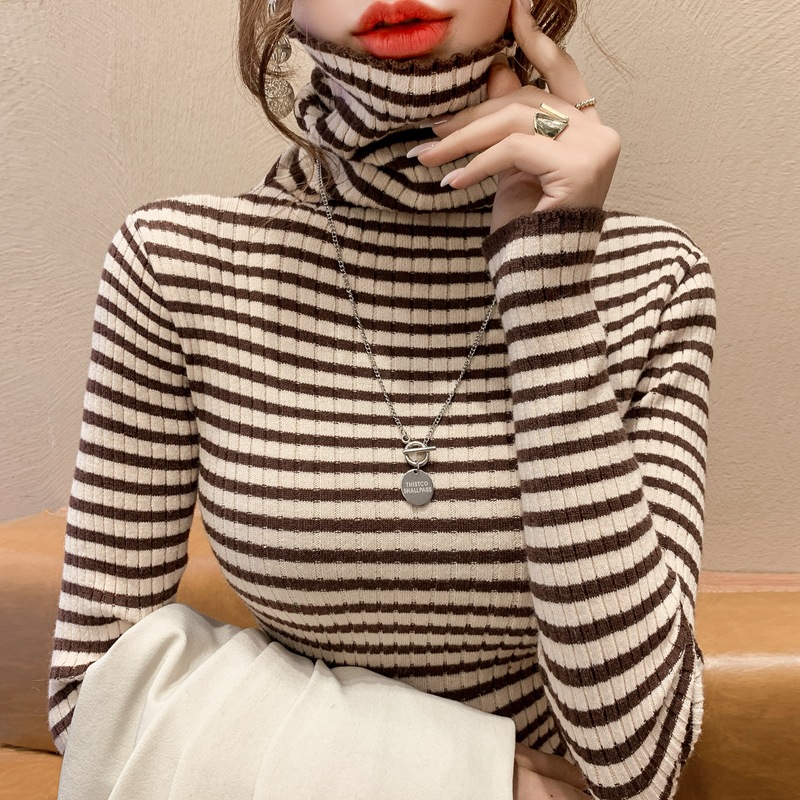 High-neck sweater women's autumn and winter 2022 new style stylish striped base layer women's long-sleeved fitted knitted top