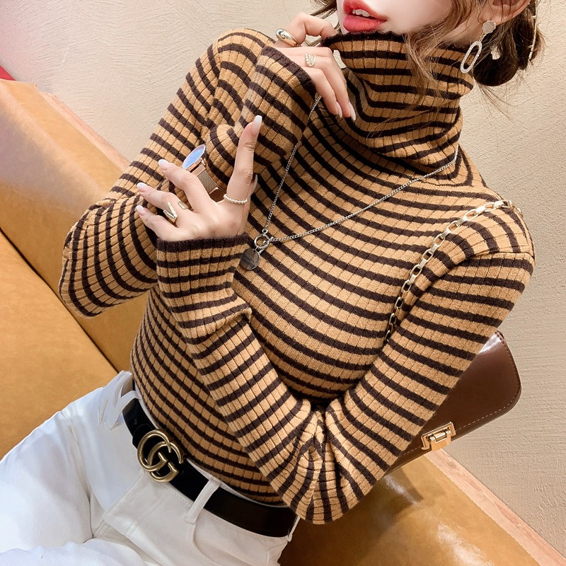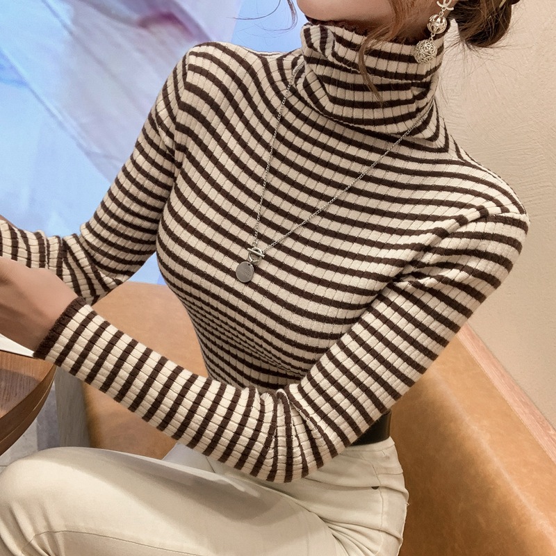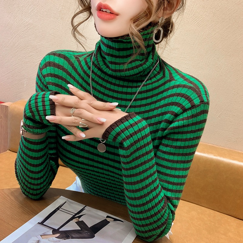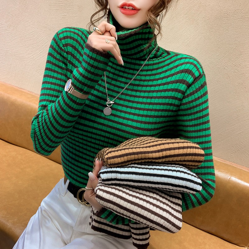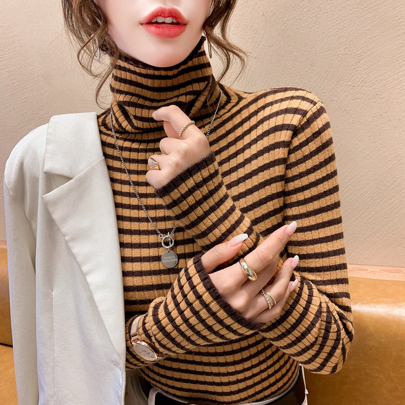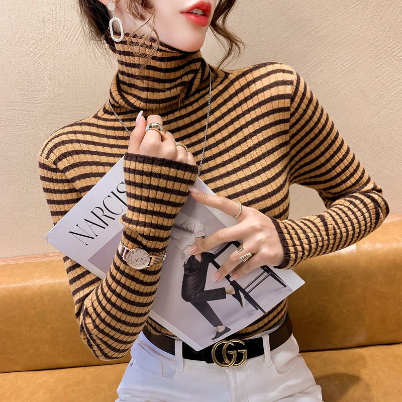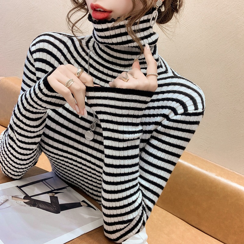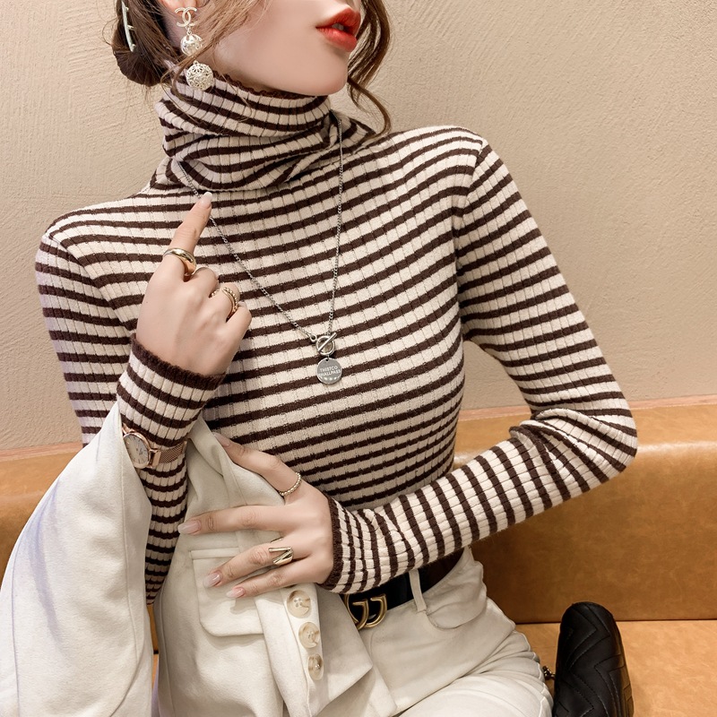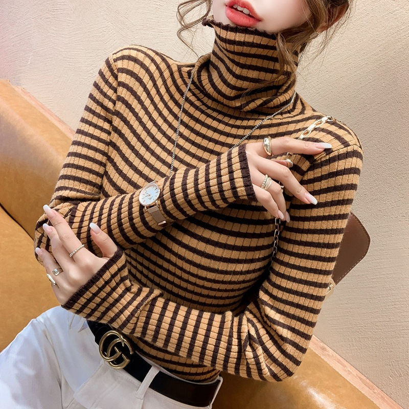 High-neck sweater women's autumn and winter 2022 new style stylish striped base layer women's long-sleeved fitted knitted top