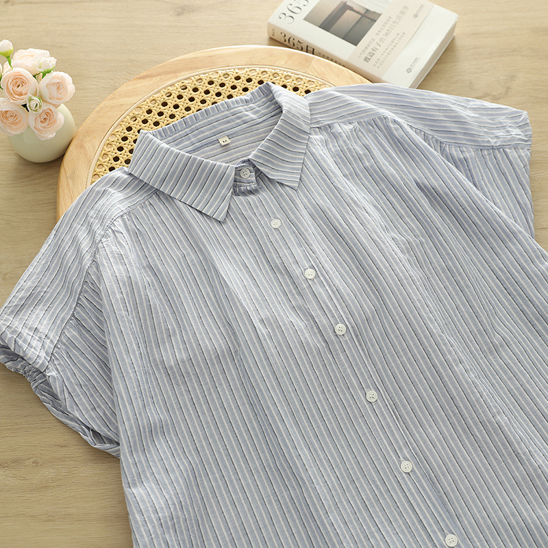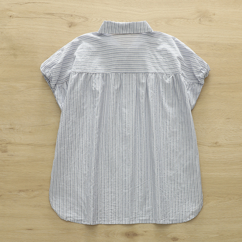 High-quality Korean striped short-sleeved shirt for women's summer export, pure cotton, concealing flesh and slimming, bat-sleeved top