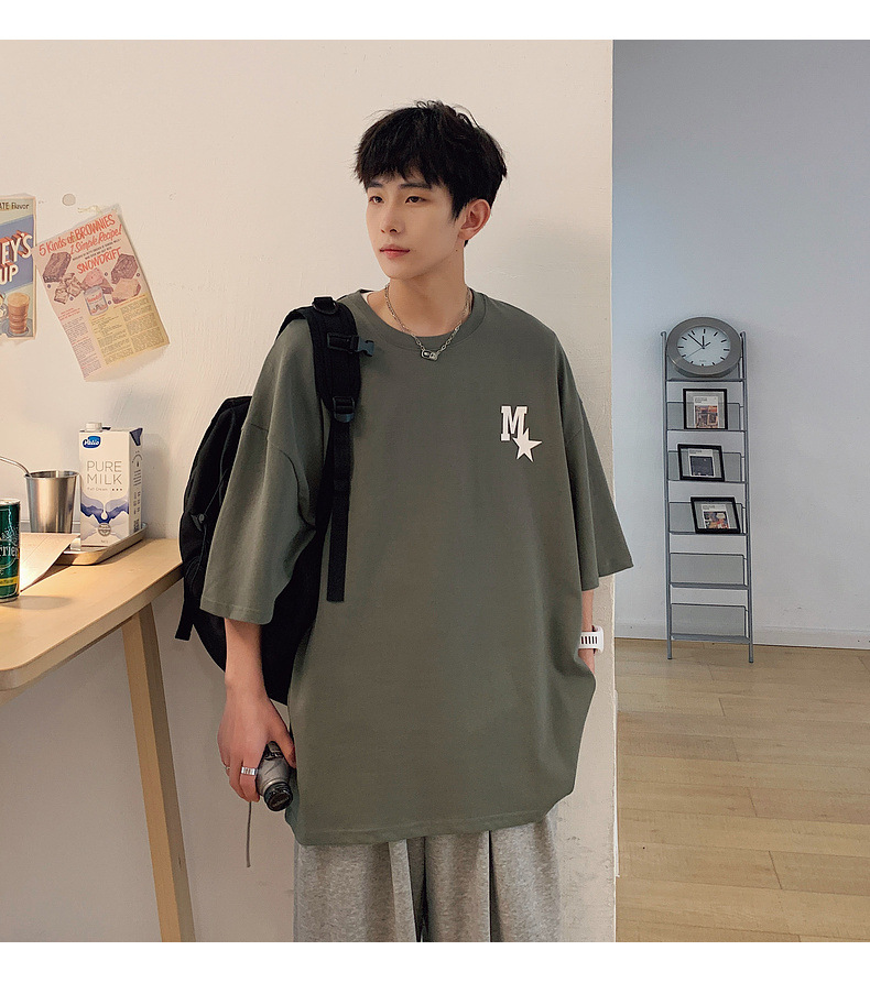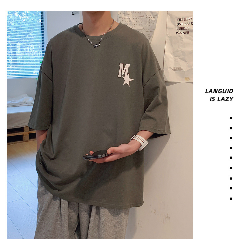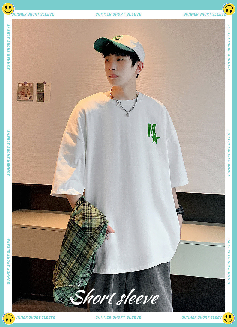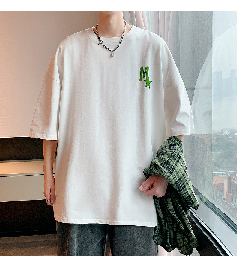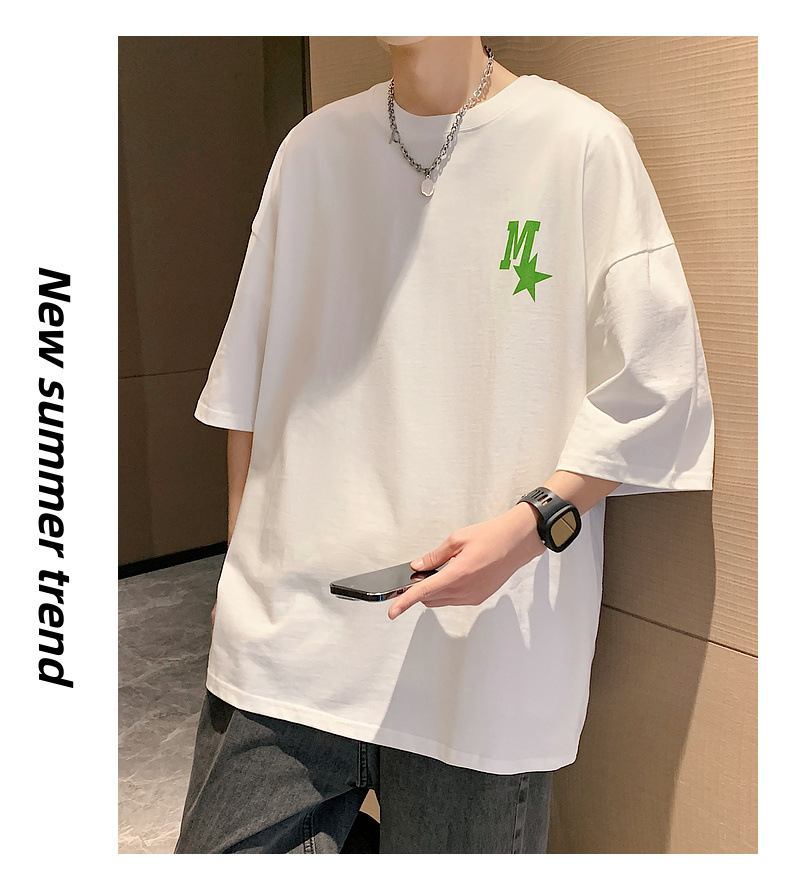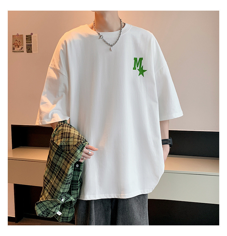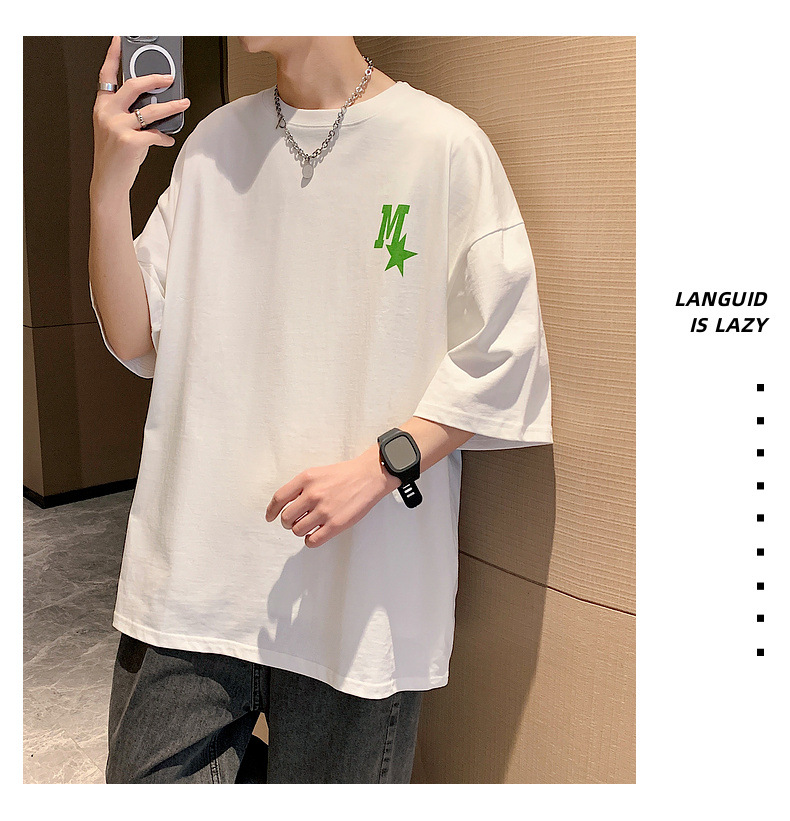 High-quality men's T-shirt, summer Hong Kong-style loose pure cotton short-sleeved T-shirt, couple style, simple and versatile five-quarter sleeve top