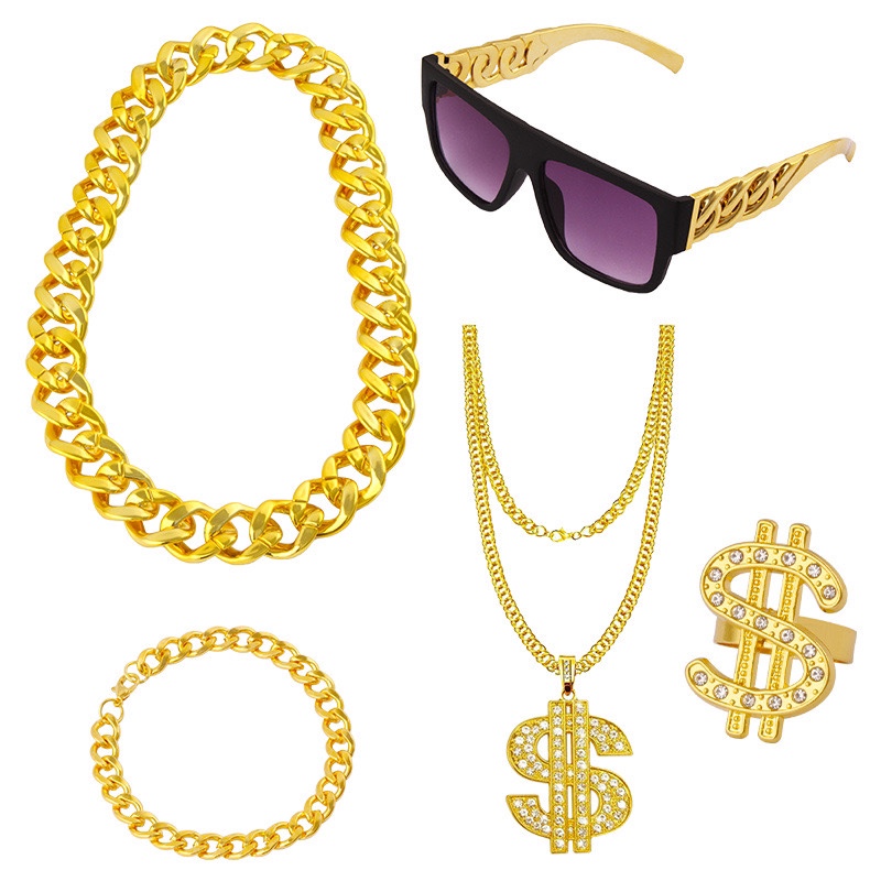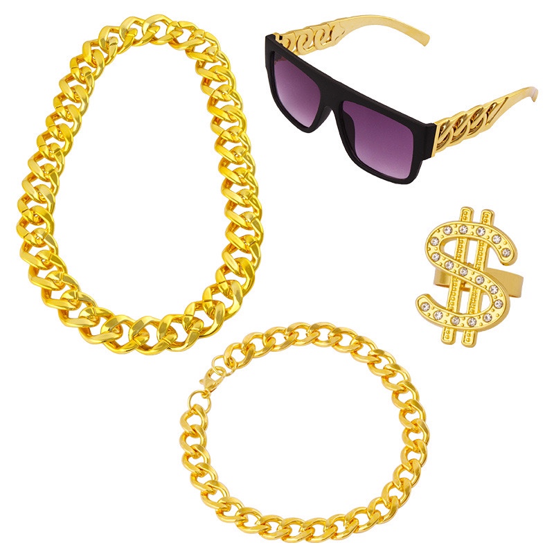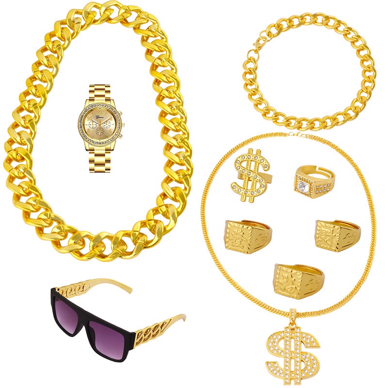 Hip-hop accessory set, exaggerated rap accessories, sunglasses, large gold chain, US dollar pendant, ring, large gold watch accessory set