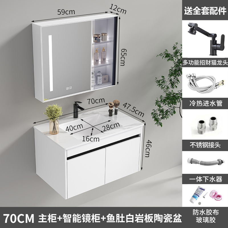 70cm smart mirror cabinet, white rock plate ceramic basin [White honeycomb aluminum]
