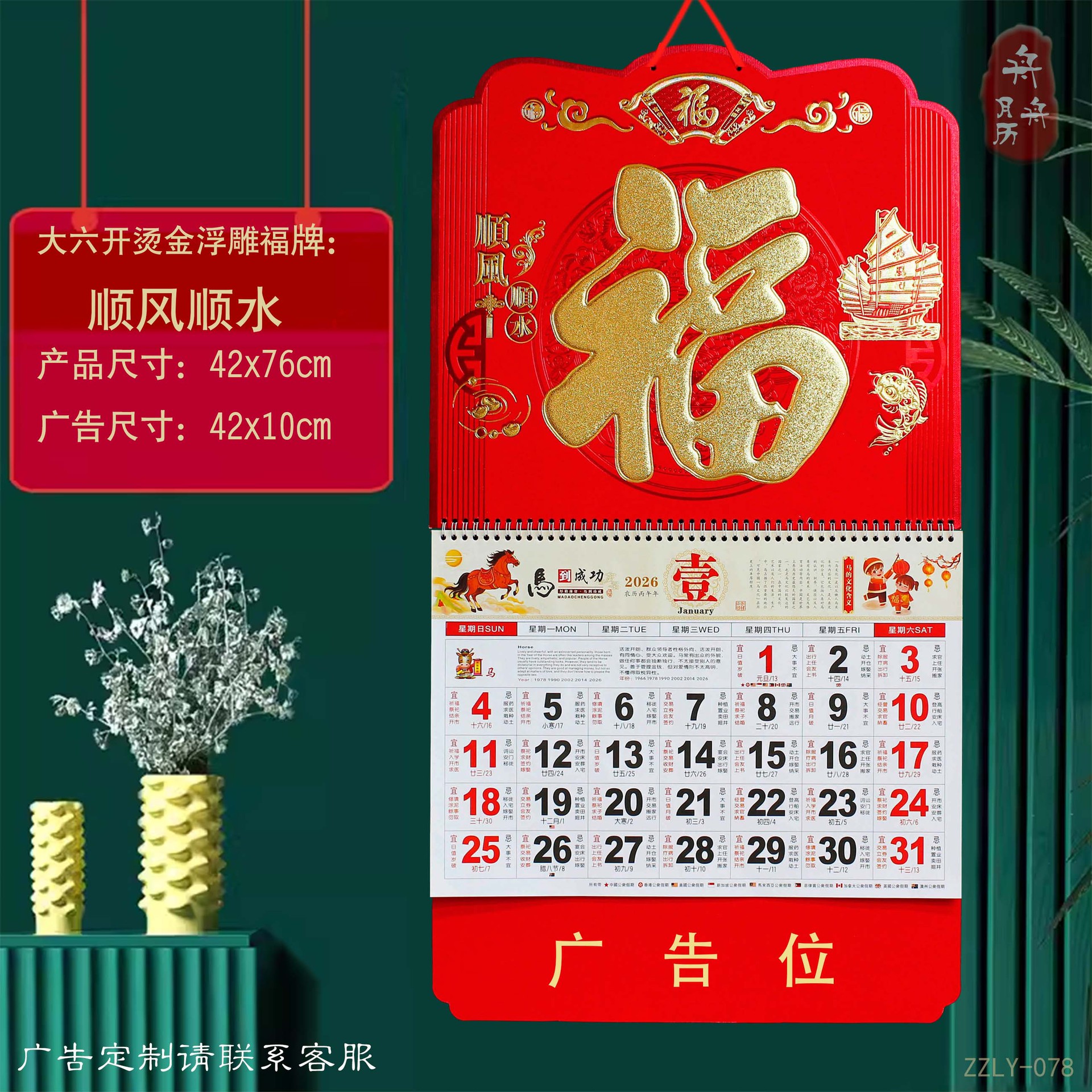Horse Year "Fu" character hanging tag calendar 2026 Company advertising Creative monthly calendar Chinese style Fu tag home calendar almanac