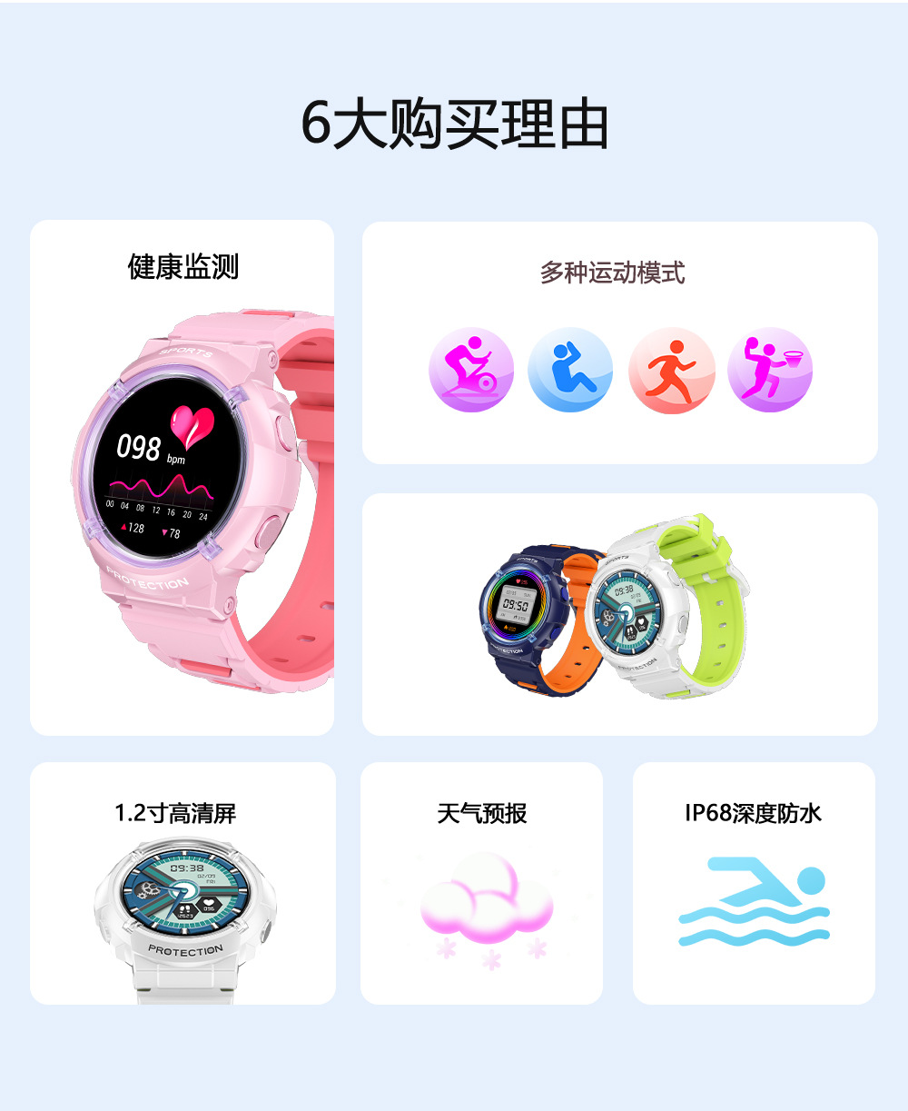 - Four-color trendy color matching (pink/blue/white/black), silicone strap is skin-friendly and breathable, suitable for both sports and daily use