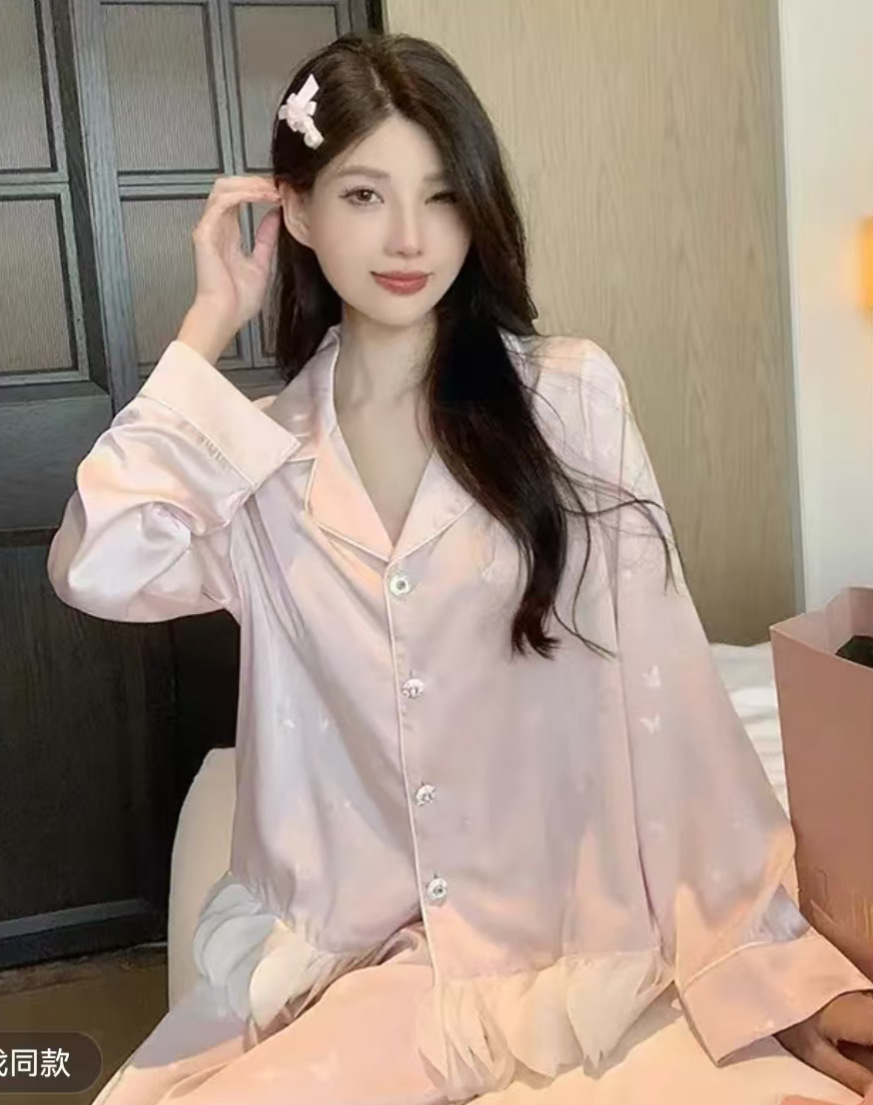 Ice silk pajamas for women Spring and autumn long-sleeved two-piece set, high-end French butterfly print with chiffon lace home wear