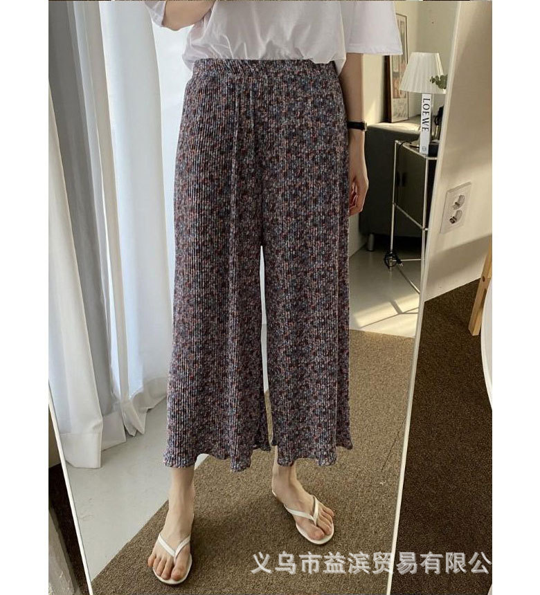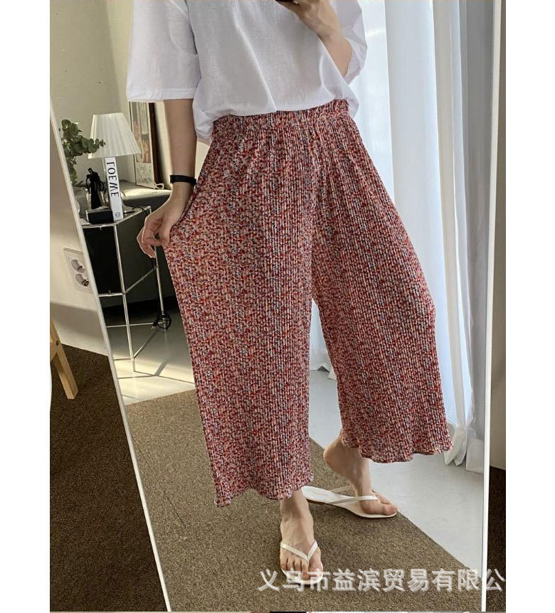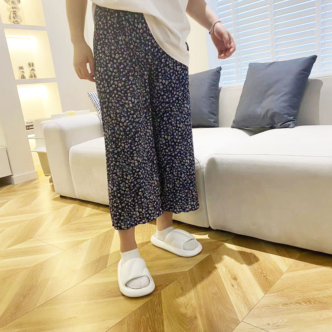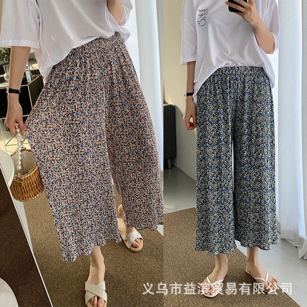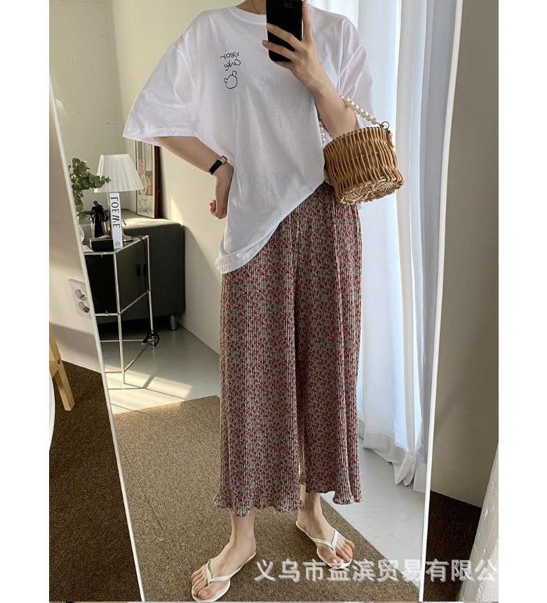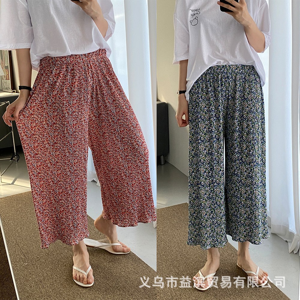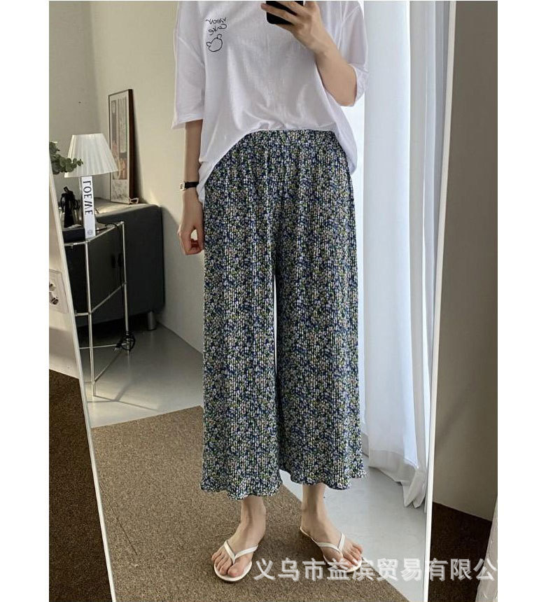 Ice silk wide-leg women's spring and summer thin pajama pants, high-waisted, drape, pleated, laid-back style, floral print home casual pants, Korean style