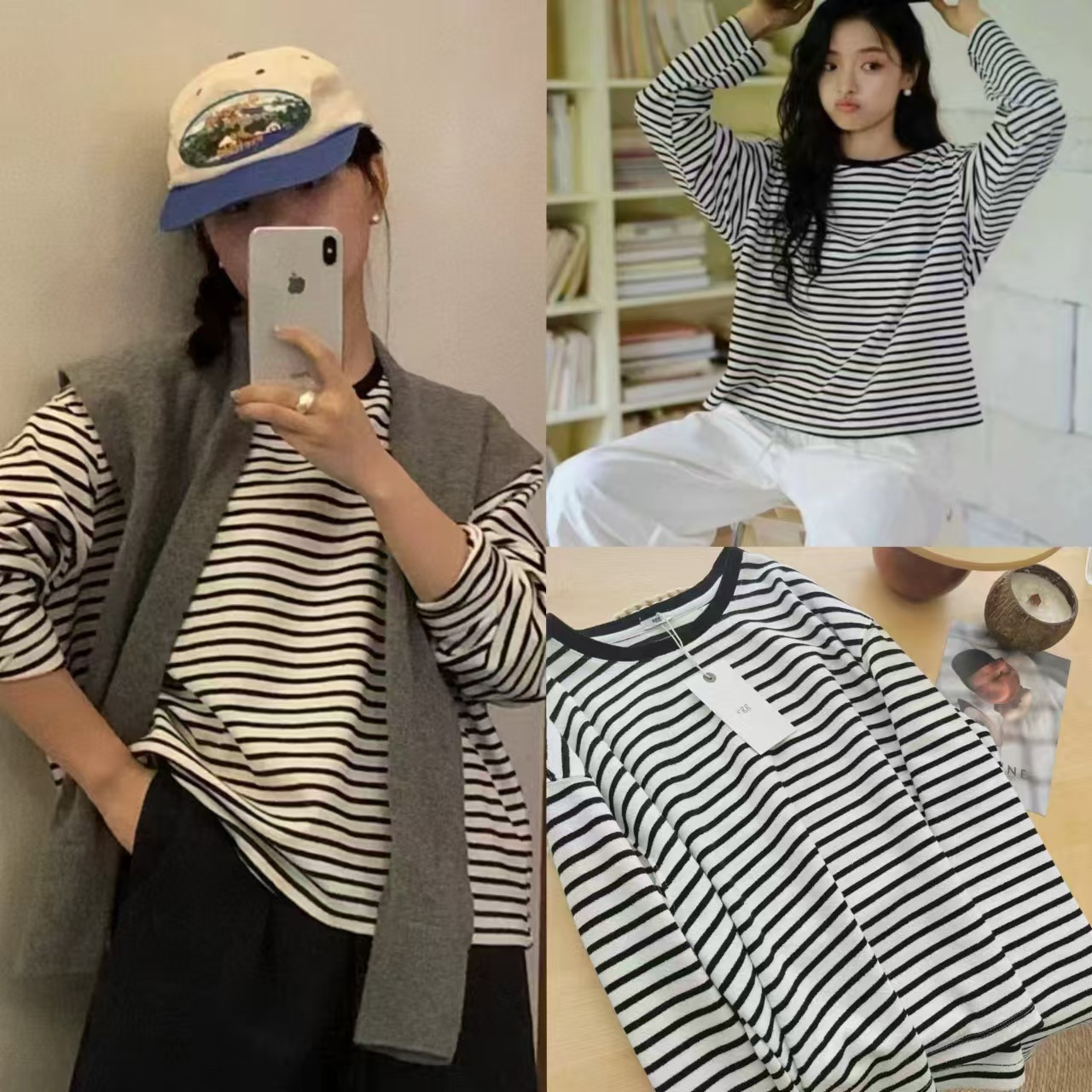 【 In Stock 】egg Loose color contrasting striped T-shirt for Women 2024 Egg Family Autumn to Show off a petite figure top