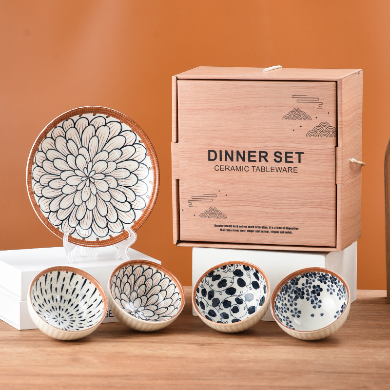 ins Japanese tableware, ceramic bowls, household rattan tableware, dinner plates, retro bowls, gift box sets wholesale
