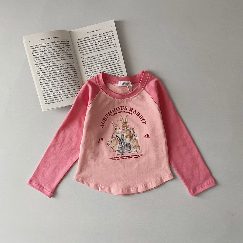 Ins-style color-blocking children's Korean-style printed base shirt, new spring and autumn girls' off-the-shoulder long-sleeved fitted outer T-shirt