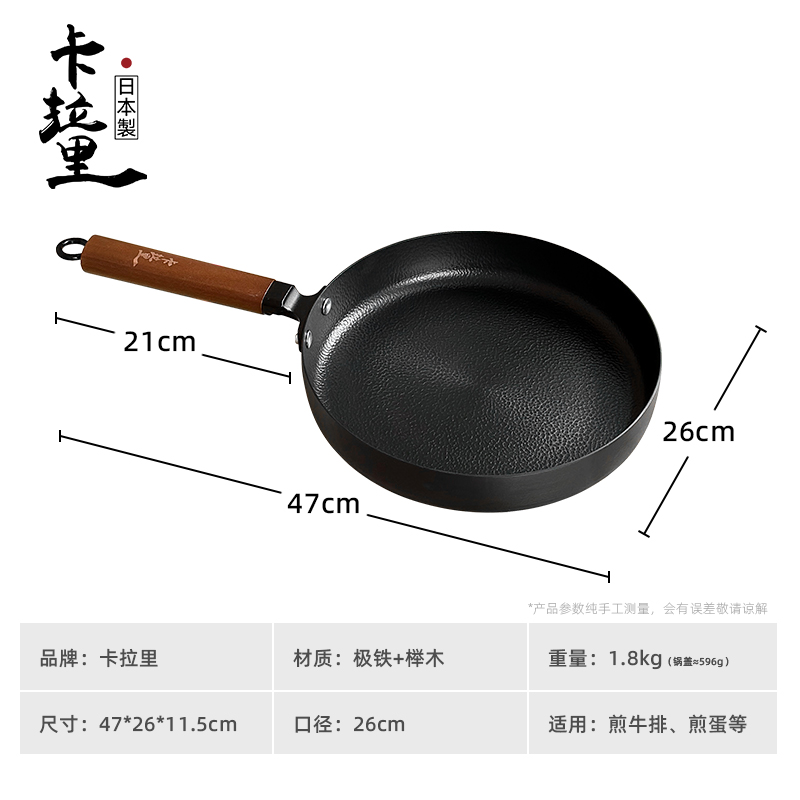Japanese Karari 26cm hammer-textured, uncoated, non-stick extreme iron frying pan, flat pan, steak pan, frying wok