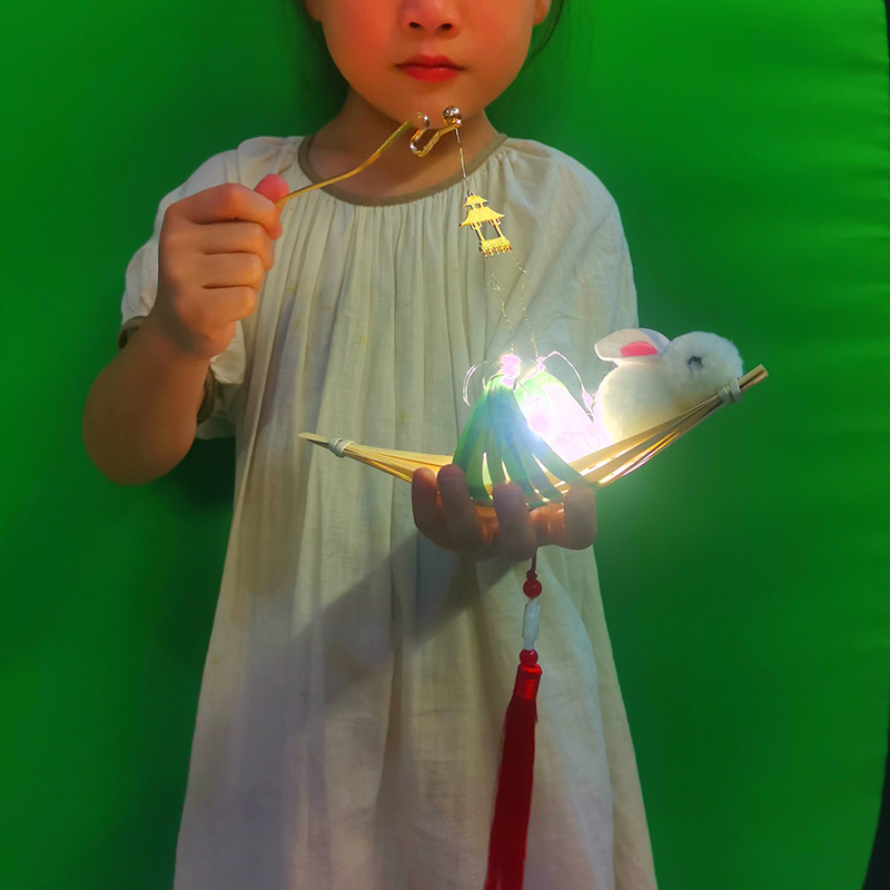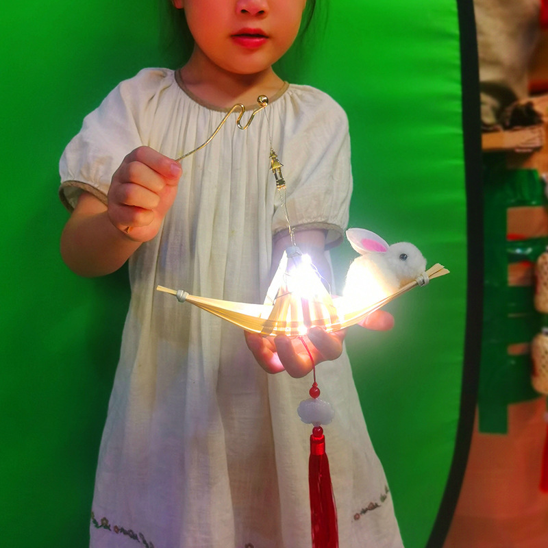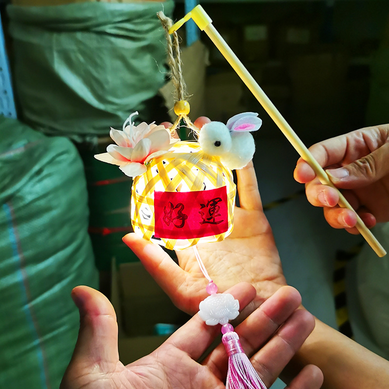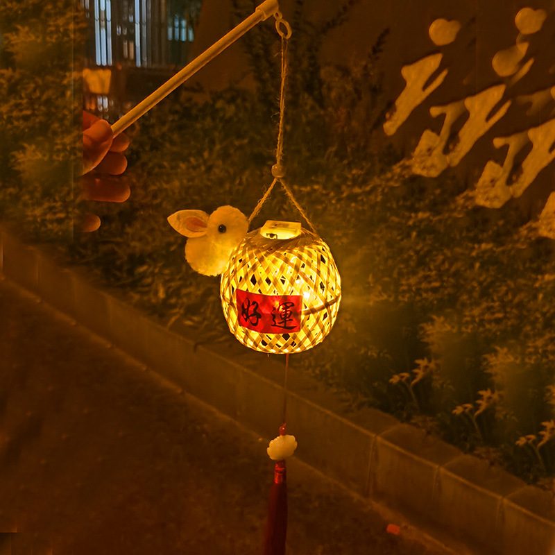 One 6.6cm bamboo round lantern with green (mixed characters) flowers and rabbit wooden poles