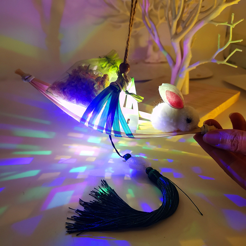 A 21cm bamboo boat with a golden pole and a golden house, and one red lantern per string