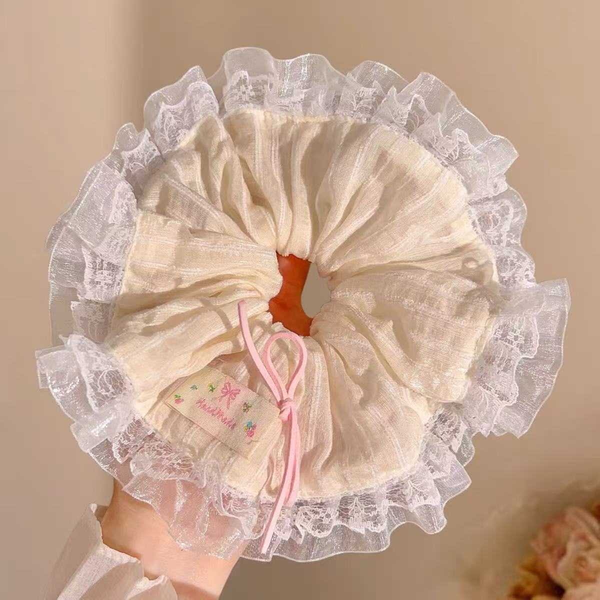 34# Cream-colored lace gauze pearl bow, approximately 15cm